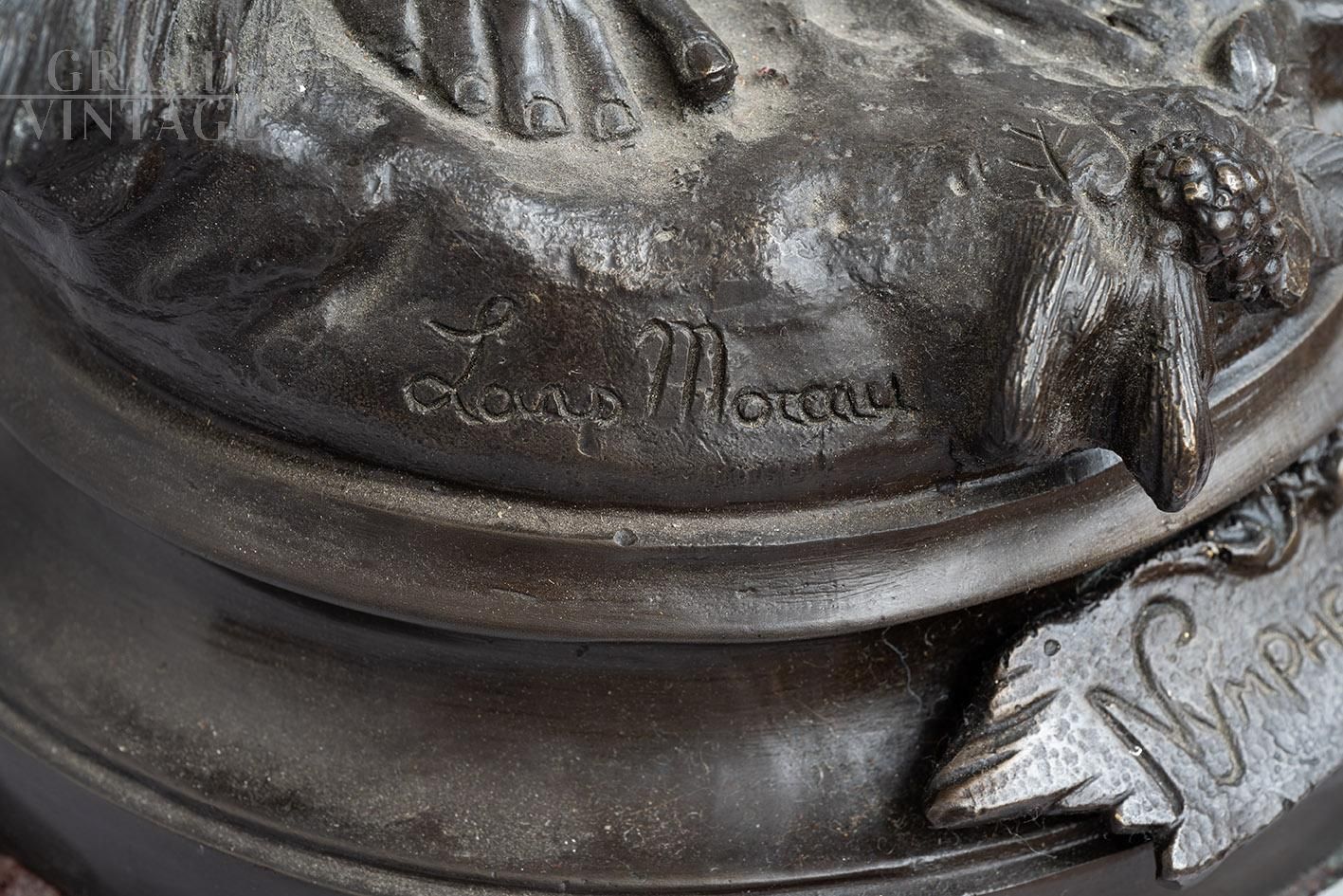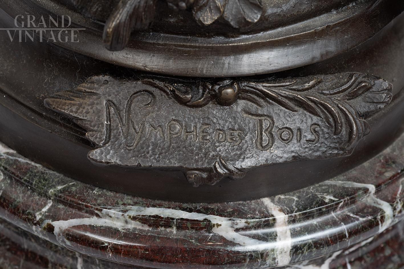 Scultura antica in bronzo patinato firmata "Louis Moreau" poggiante su base in marmo rosso levanto. La scultura raffigura la Nymphe de Bois ed è un'affascinante rappresentazione della mitica ninfa dei boschi dell'antica leggenda, realizzata da Louis Moreau, uno degli straordinari membri della famiglia Moreau che dominò il mondo della scultura nella seconda metà del XIX secolo e all'inizio del XX secolo a Parigi. La giovane donna viene raffigurata in atteggiamento gioioso mentre viene avvolta da elementi vegetali e volatili e poggia su una base sempre ad elementi vegetali. Il personaggio con drappo attorno ai fianchi in una posa sensuale e contemplativa, il corpo è flessuoso slanciato e ben modellato con cura anatomica e naturalismo nei dettagli.