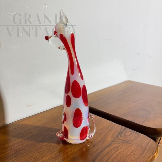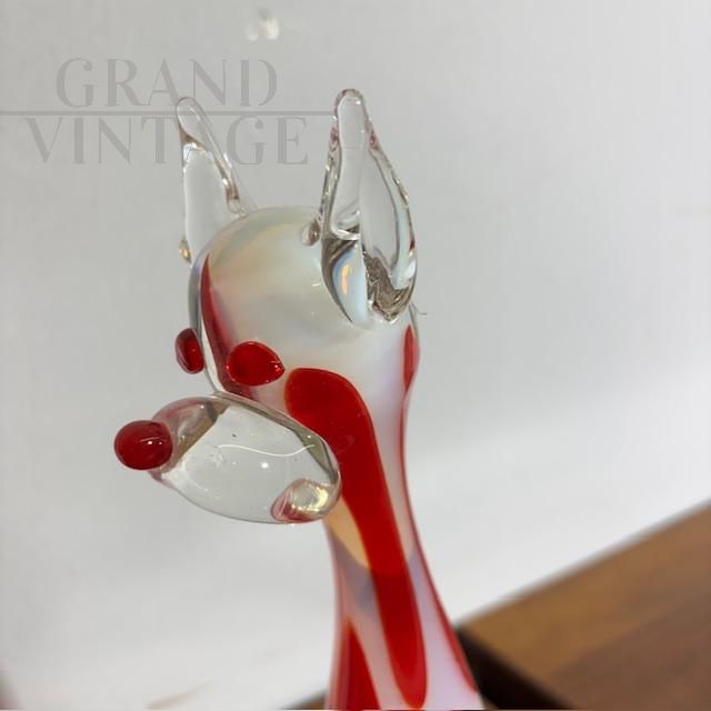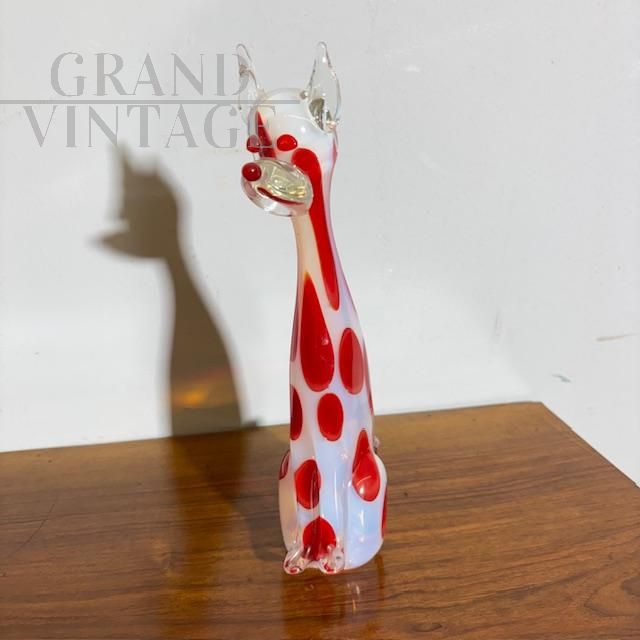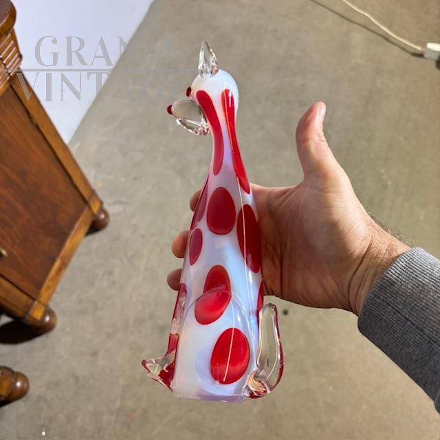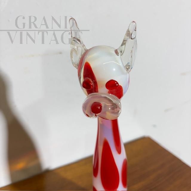 Scultura vintage in vetro Murano raffigurante un cane in colore bianco trasparente con pois rossi, Italia anni '70. Altezza 31 cm.