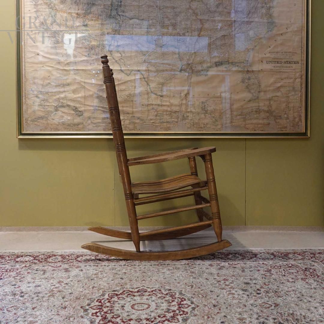 Sedia a dondolo vintage in legno con schienale alto e parti elegantemente tornite.