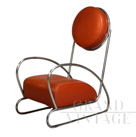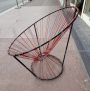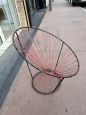 Poltroncina disegnata dall' A.R.P - Atelier de recherche plastique, un team di designer francesi formato da Pierre Guariche, Joseph-André Motte e Michel Mortier. La poltrona ha una struttura in metallo laccato nero e corda rossa intrecciata con la tipica forma a uovo. Francia 1955 circa.