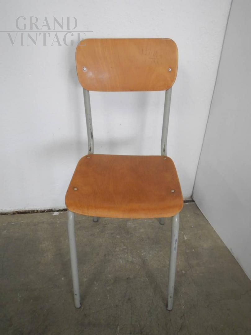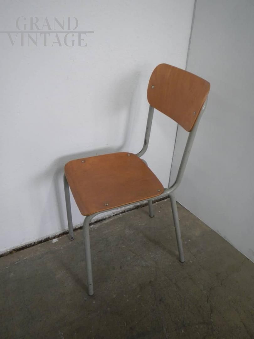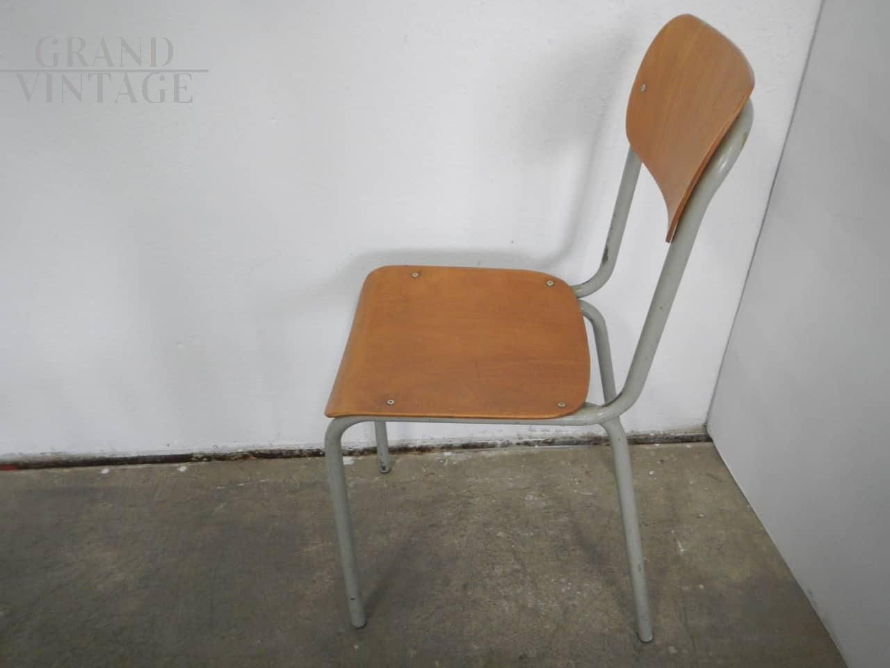 Sedia scolastica vintage anni '70 con struttura tubo metallico laccato grigio e seduta e schienale in legno di faggio.