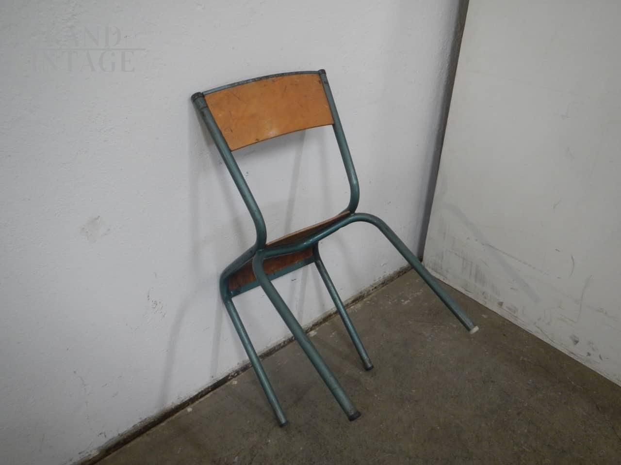 Sedia design industriale prodotta da Mullca in Francia, anni '60, in ferro laccato verde con seduta in listellare di legno chiaro di betulla. Misure seduta cm 45 x 45. In buone condizioni con segni uso.