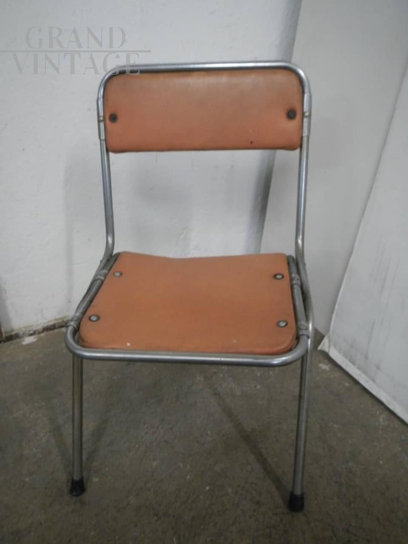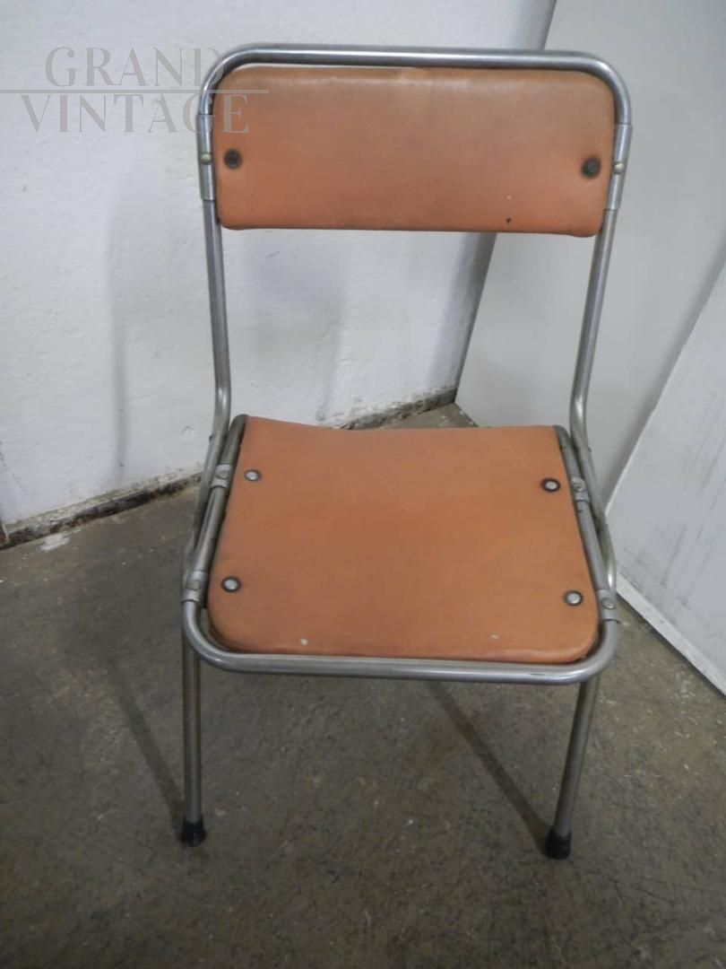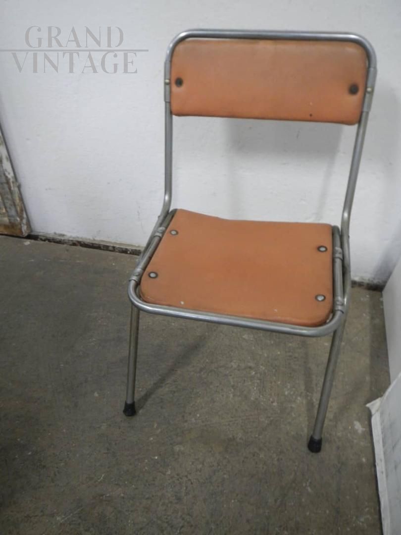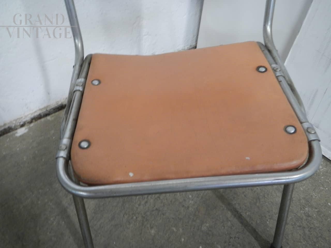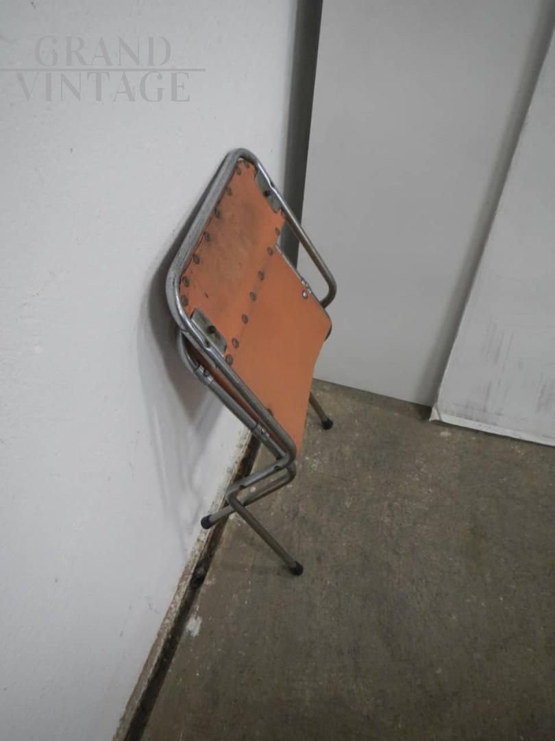 Sedia da bambino pieghevole vintage in metallo e similpelle, struttura buona con naturali segni d’uso. La seduta misura 27 cm.