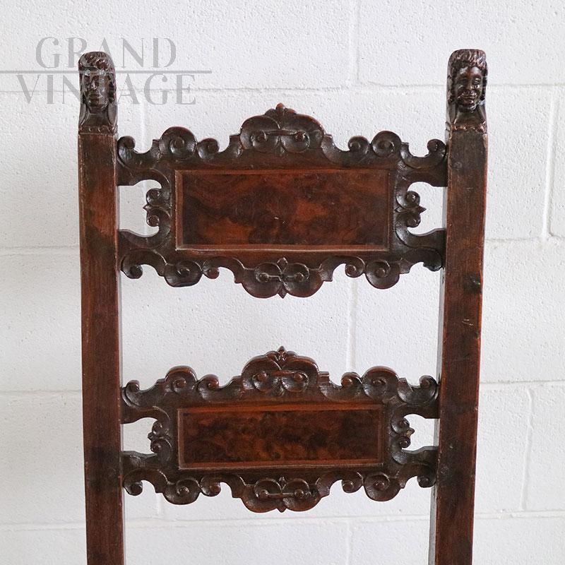 Sedia antica rinascimentale con schienale alto, realizzata in noce intagliato e decorata con due busti di donna nella parte superiore dello schienale, oltre a gigli e fogliame nei traversi.