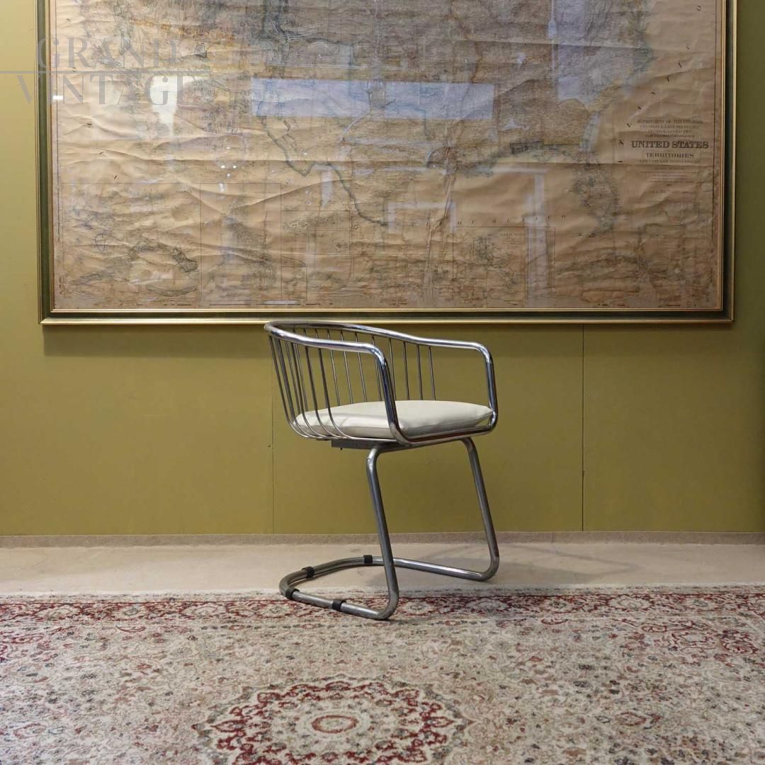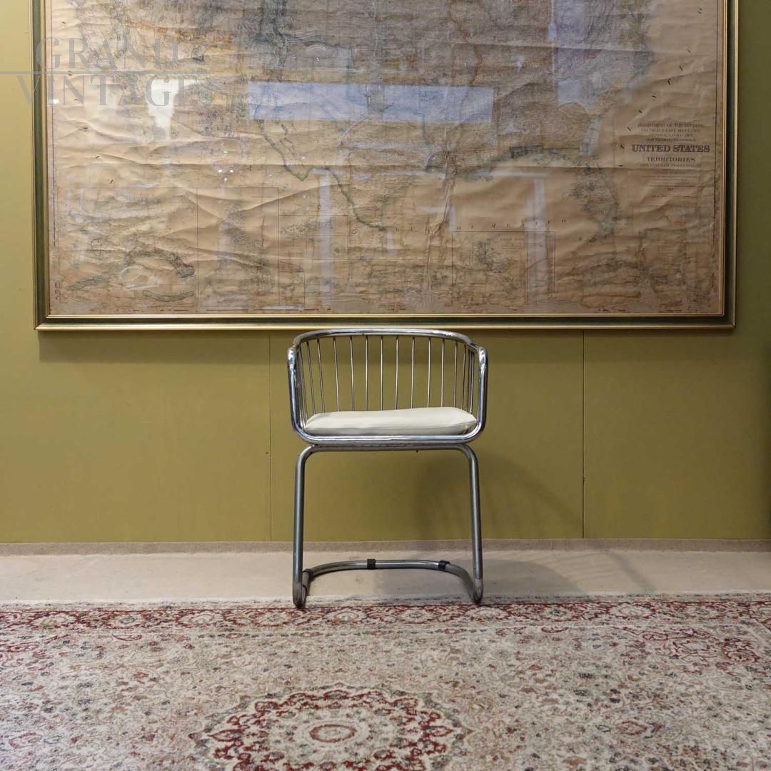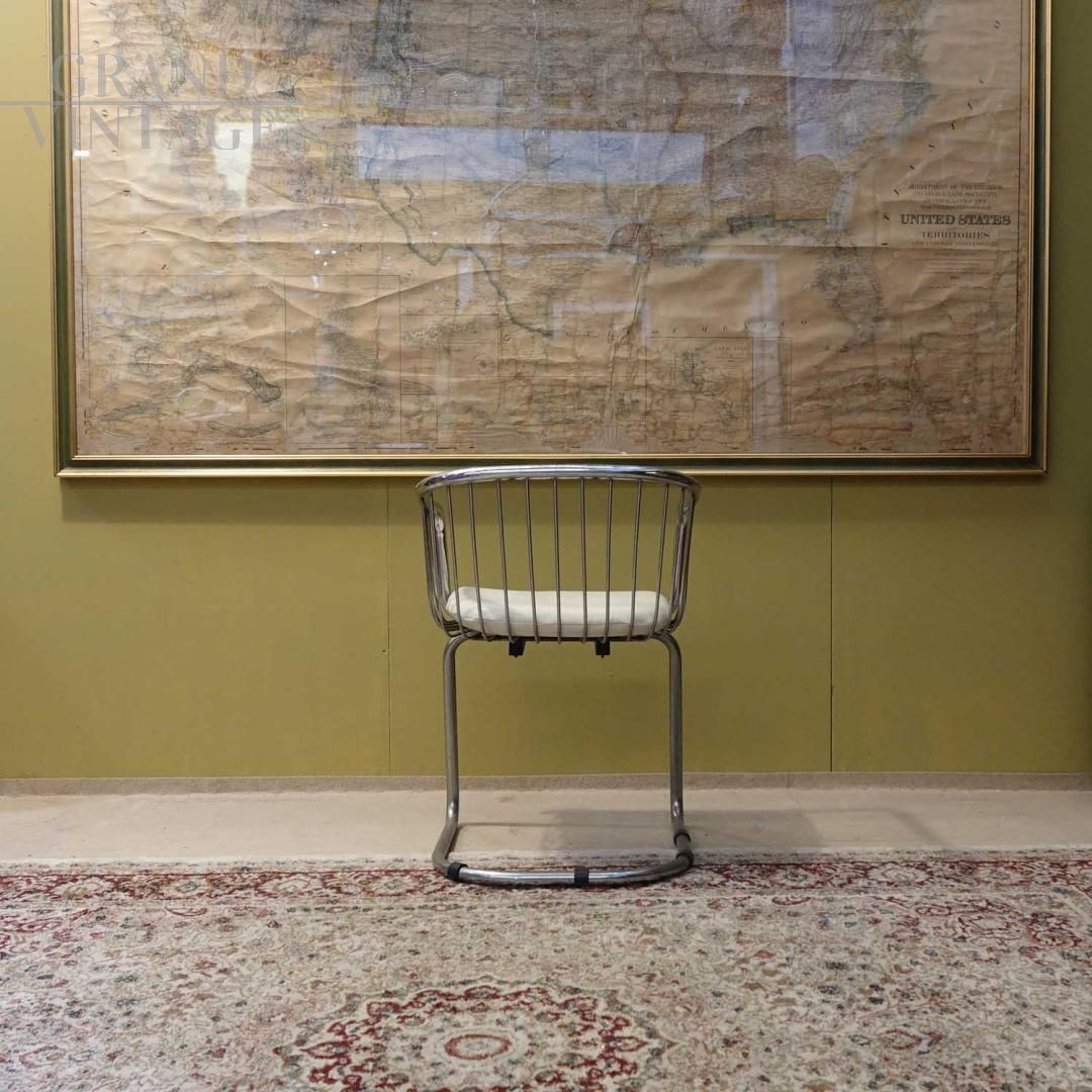 Questa sedia vintage a sbalzo in metallo cromato è un classico intramontabile del design industriale, e prende ispirazione dal designer Gastone Rinaldi. Linee essenziali, struttura solida e uno stile deciso la rendono perfetta per ambienti retrò, loft contemporanei o spazi creativi dal gusto minimale e ricercato.
