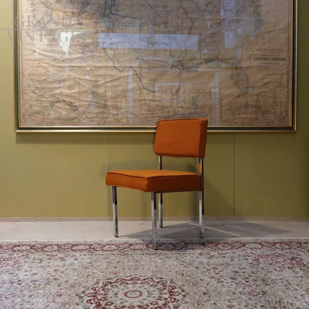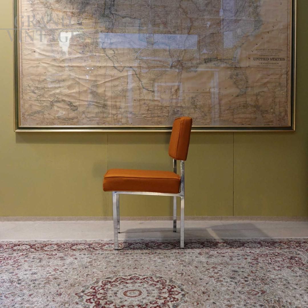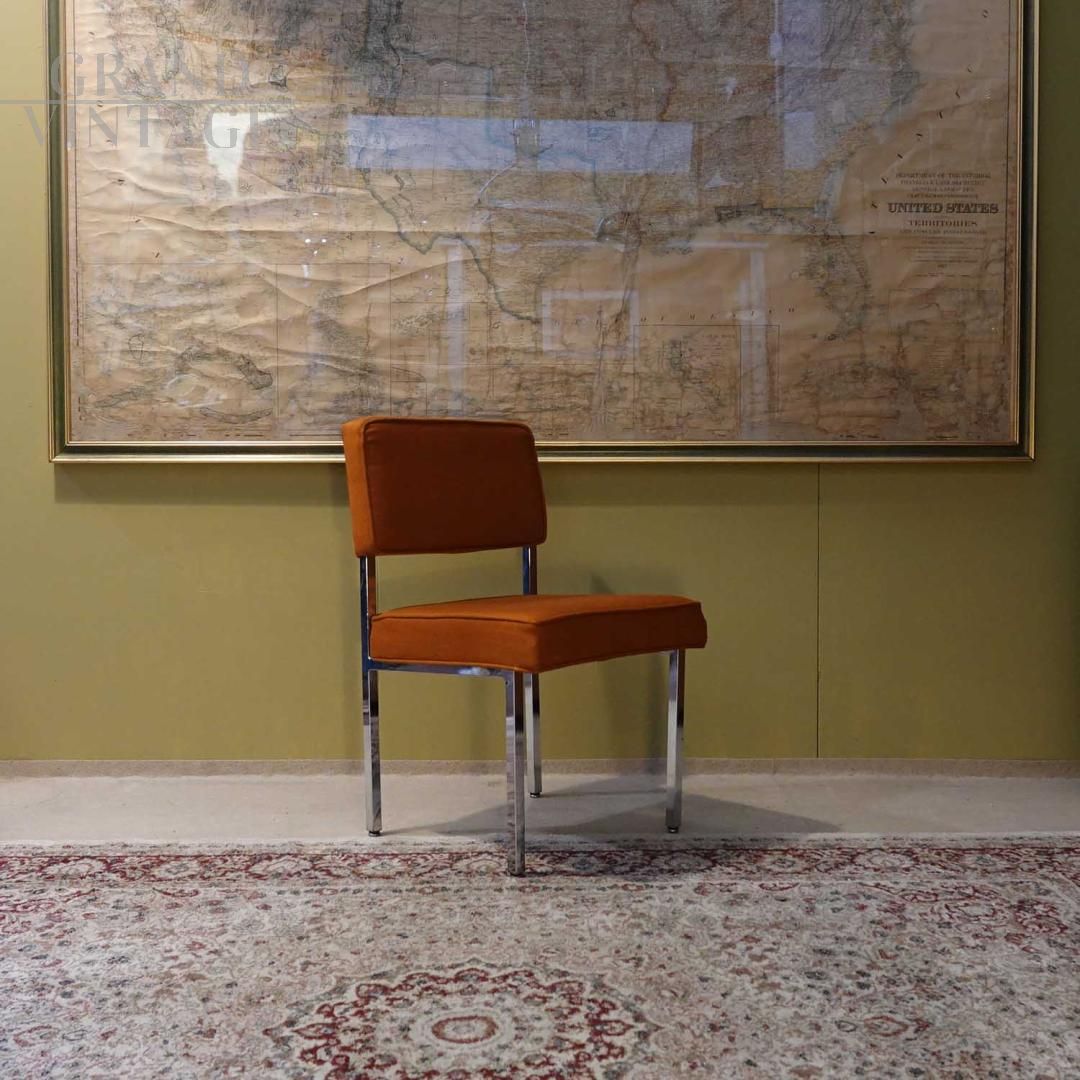 Sedia vintage moderna in metallo cromato e tessuto arancione, dal design essenziale e versatile. La struttura solida e le linee pulite si uniscono a una seduta confortevole, rendendola perfetta per sale da pranzo, cucine contemporanee o ambienti di lavoro dal gusto minimal e funzionale.