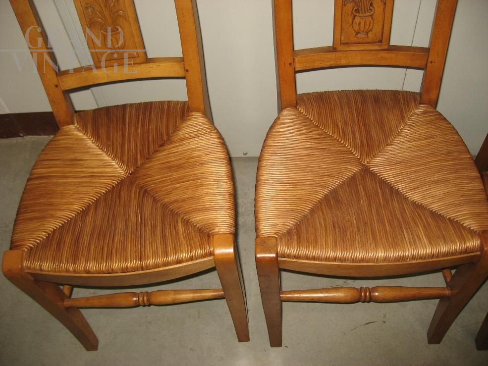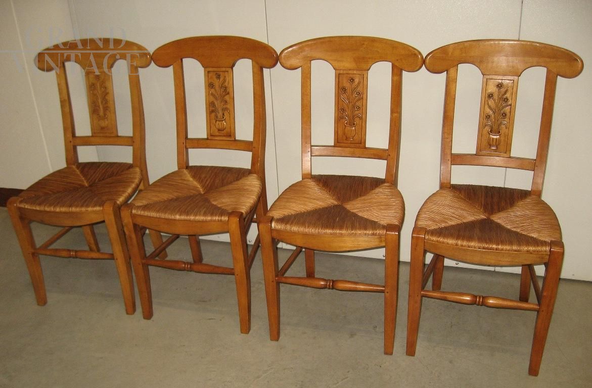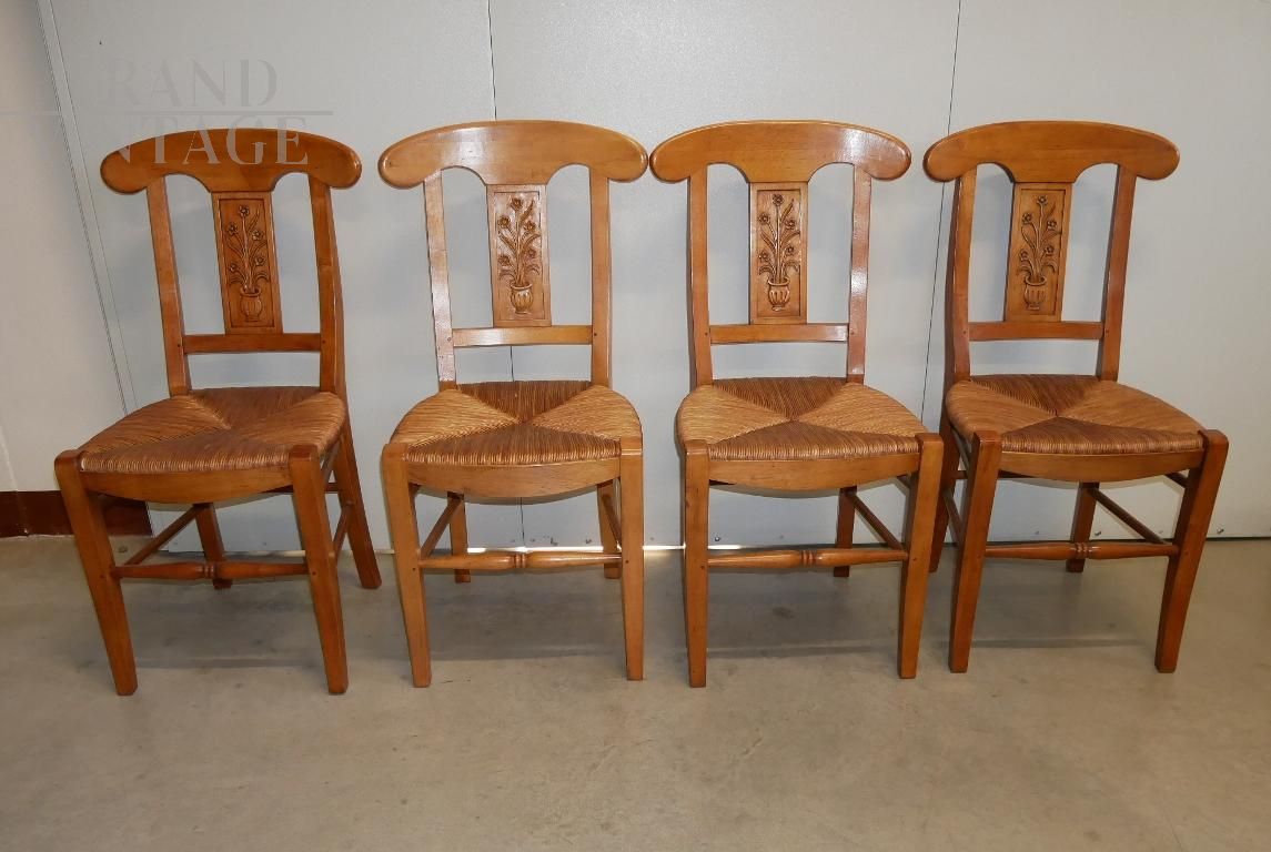 Set di 4 sedie in stile antico in noce mielato con sedute impagliate e begli schienali intagliati a motivo di vaso di fiori. Le sedie sono in ottimo stato di conservazione poichè mai usate, stile antico.