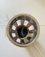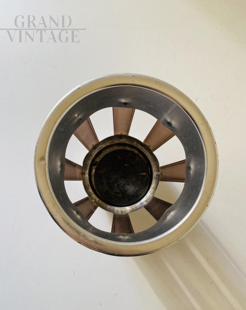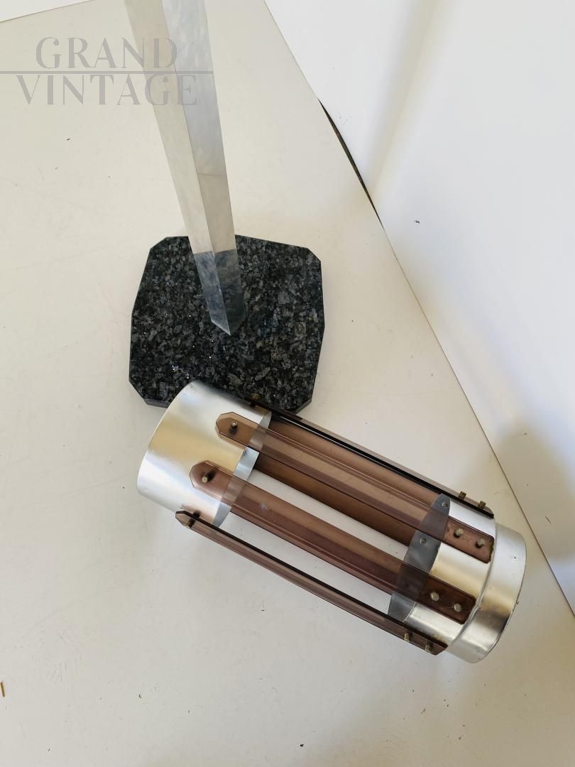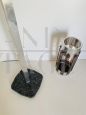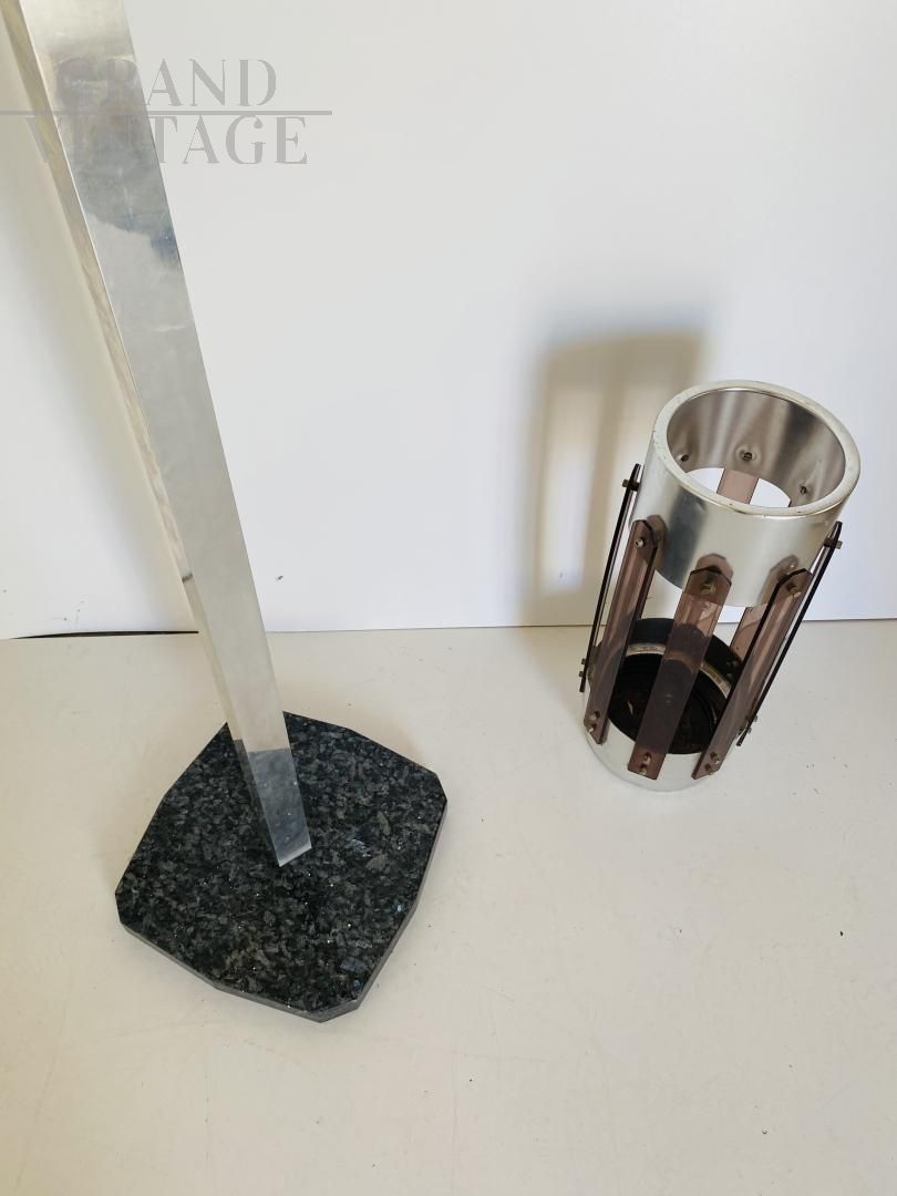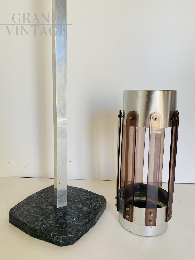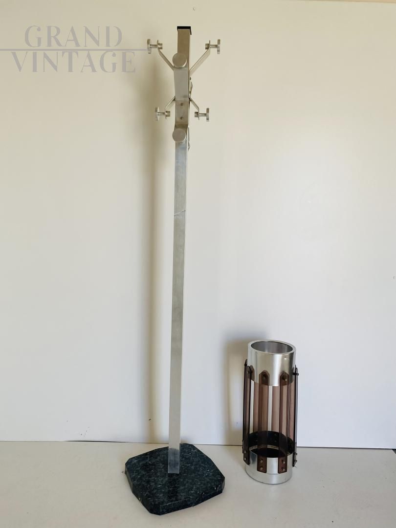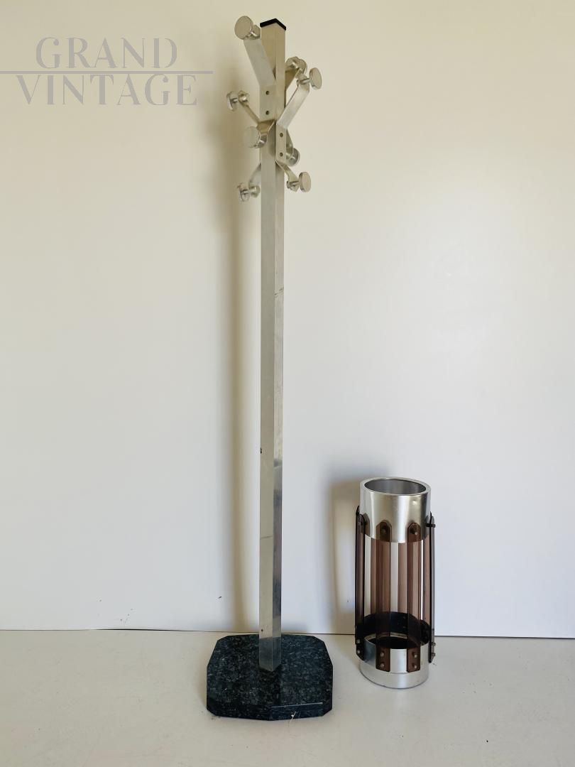 Bellissimo set vintage da ingresso composto da un appendiabiti e un portaombrelli in acciaio, anni '70. L'appendiabiti ha una base in marmo nero, il porta ombrelli è in latta color acciaio con stecche in plexiglass fumé. Il set è in buone condizioni, con naturali segni del tempo.