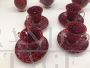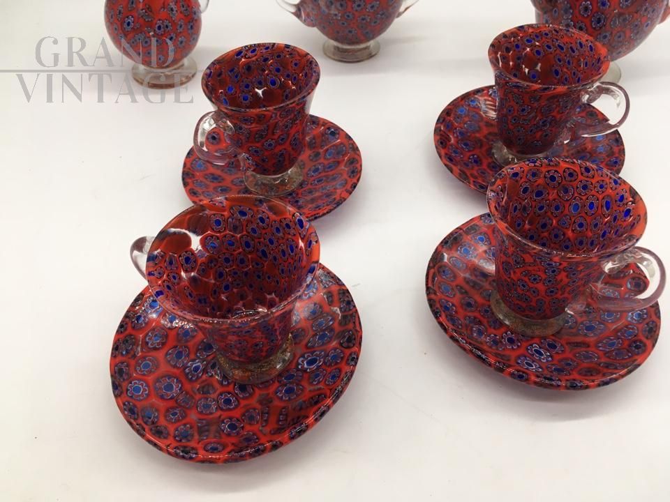 Set da caffè in vetro Murano vintage con Murrine, composto da 4 tazzine e 4 piattini, di cui uno con difetto (visibile in foto), una zuccheriera con coperchio, una caraffa con coperchio e una lattiera.