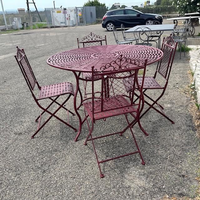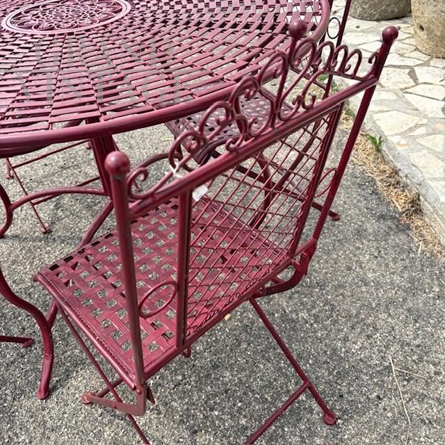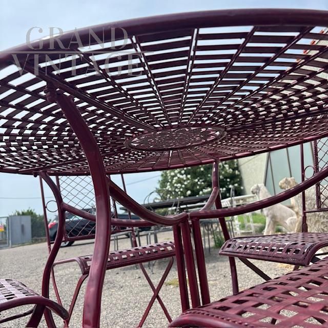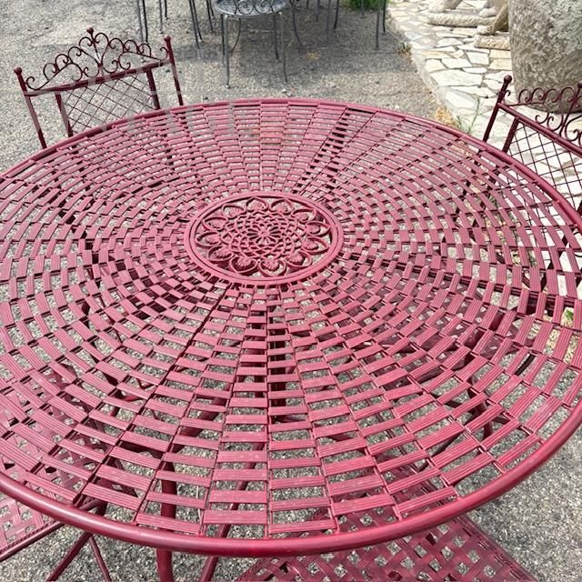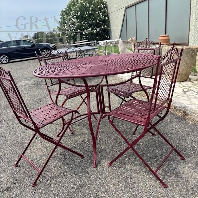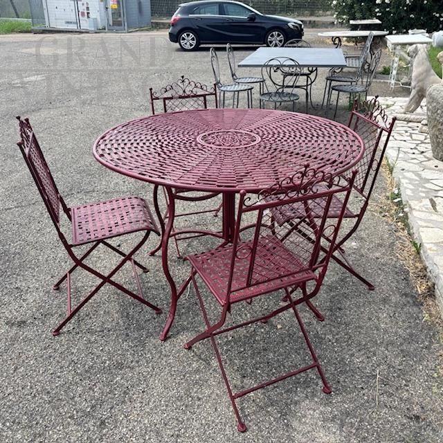Set da giardino vintage composto da un tavolo rotondo e 4 sedie in ferro battuto laccato rosso porpora, Italia anni '70. In stato molto buono.