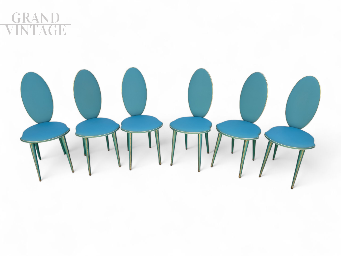 Queste affascinanti sedie da pranzo presentano un design unico e armonioso, perfetto per aggiungere un tocco di eleganza e vivacità a qualsiasi ambiente. La seduta, a forma di cuore stilizzato, e lo schienale ovale sono rivestiti in un accattivante tessuto, che conferisce un aspetto uniforme e sofisticato. Ogni sedia è sostenuta da gambe affusolate, verniciate in un distinto verde acqua e ornate con delicate rifiniture dorate. Questi dettagli non solo aggiungono un tocco di luce e raffinatezza, ma richiamano anche l'estetica generale del set completo. Il bordo sottile e dorato che contorna la seduta e lo schienale enfatizza ulteriormente le linee sinuose del design.