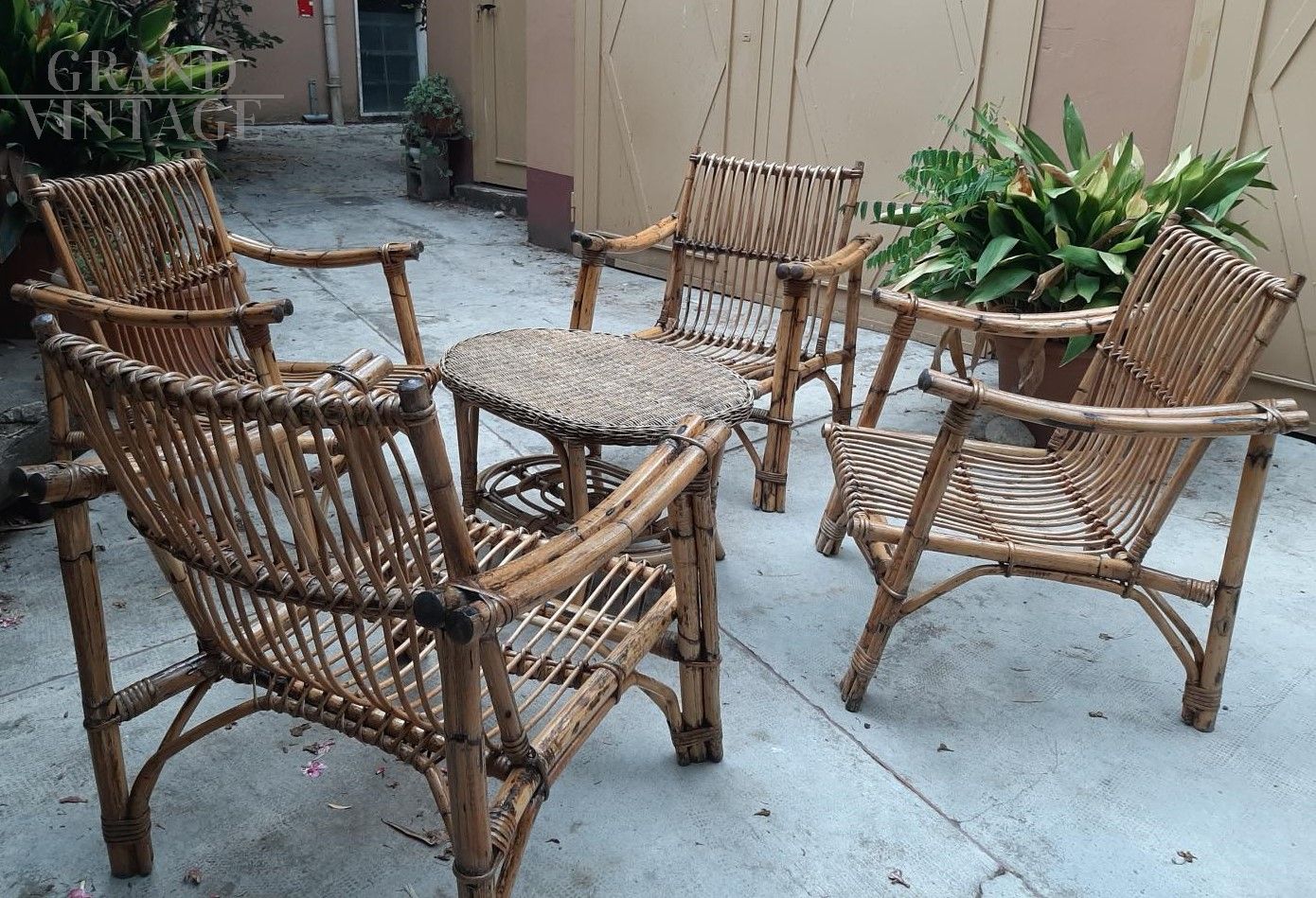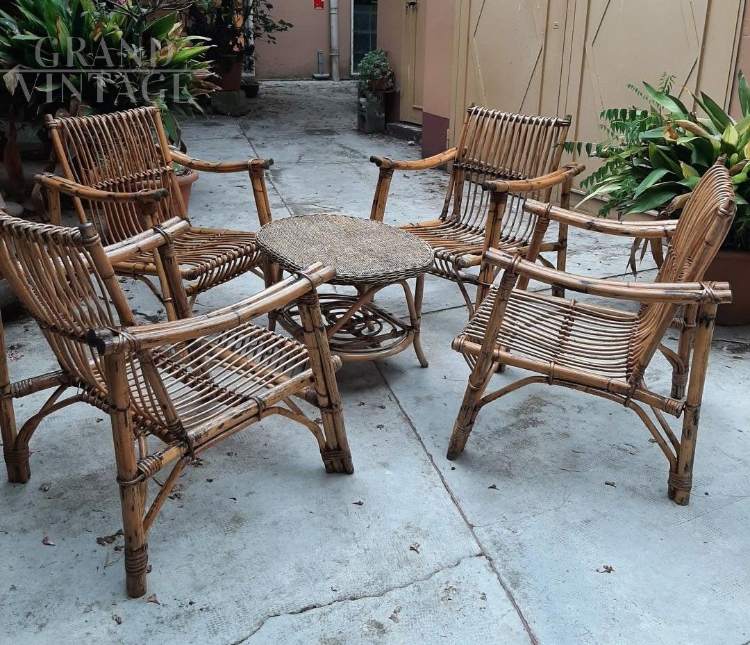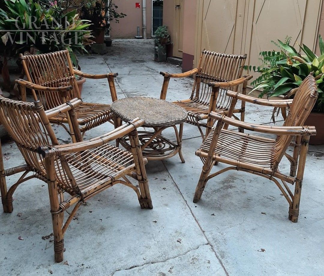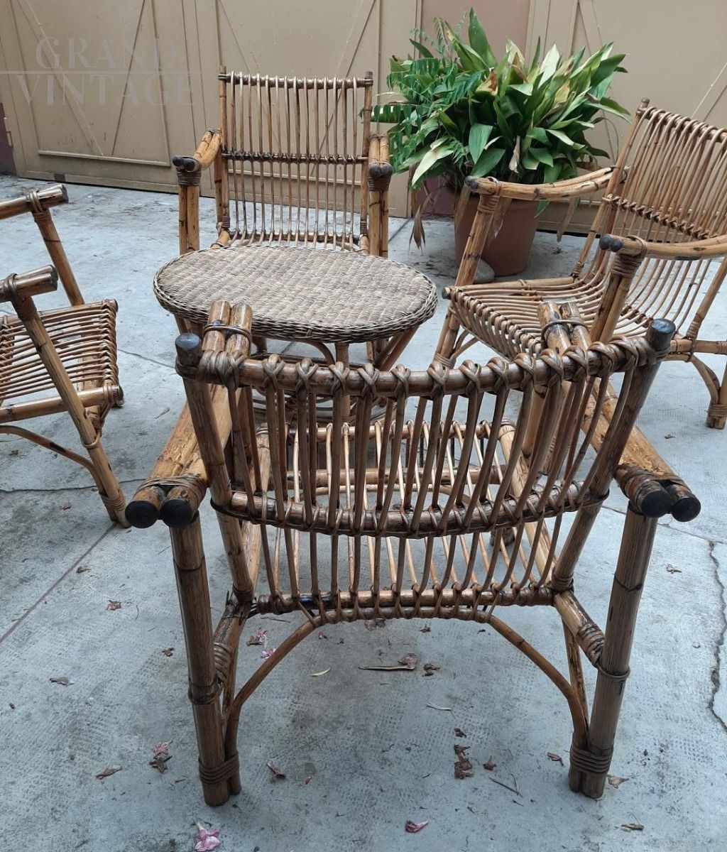Set salotto da giardino vintage in bamboo e midollino, composto da un divano a 3 posti, 4 poltrone e un tavolino, anni '40 - '50.