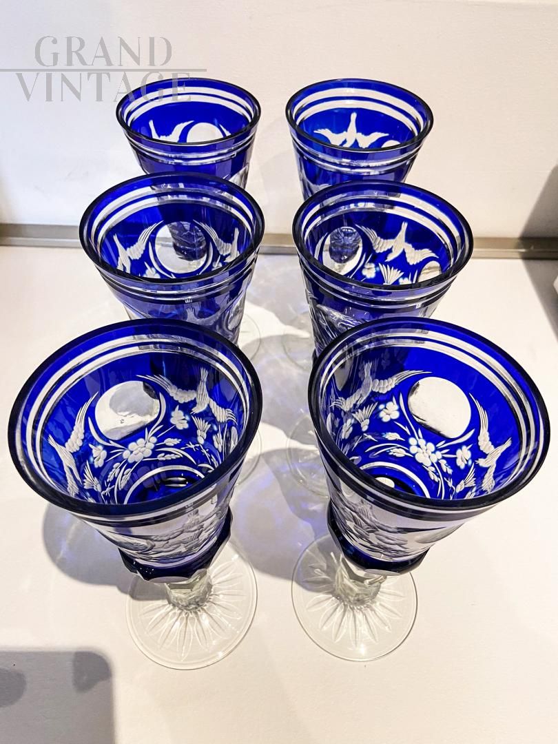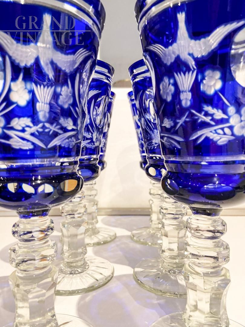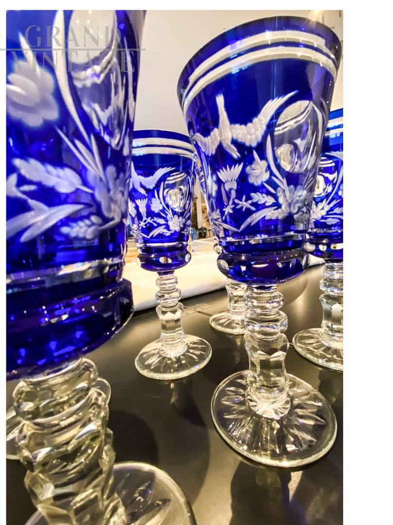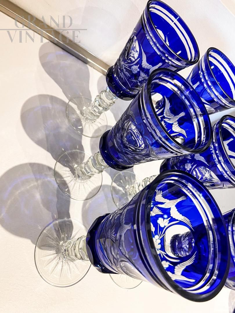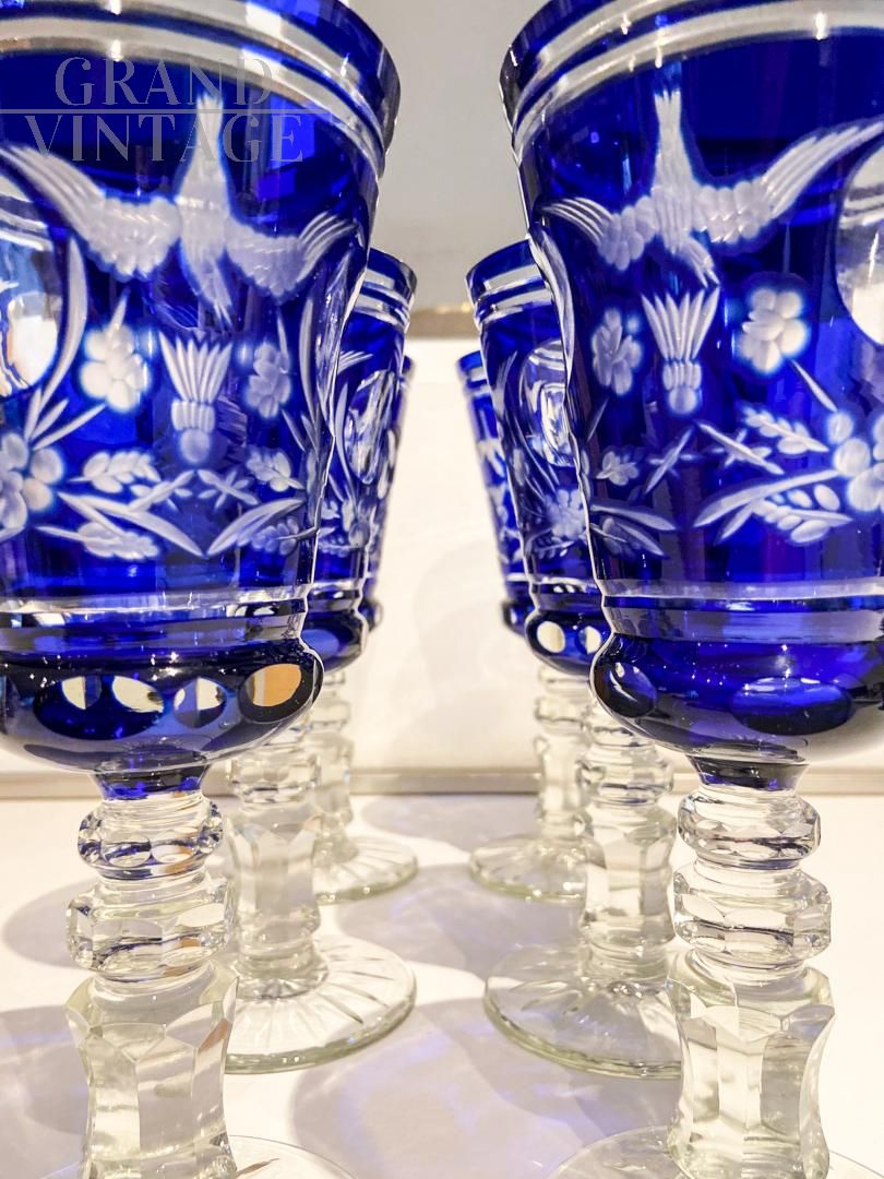 Set di 12 bicchieri e calici in vetro di Murano blu finemente decorato, Italia anni '70