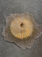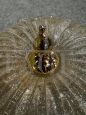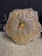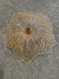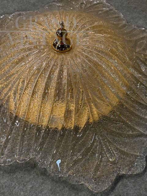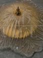 Set di tre plafoniere veneziane a forma di fiore interamente realizzate a mano in vetro di Murano attribuibili alla manifattura di Aureliano Toso. Alta la qualità artigianale e dei dettagli costruttivi. Il vetro soffiato di murano è in colore ambrato con texture in oro con una sofisticata granulata al loro interno tipica dello stile veneziano. la struttura è in metallo e il fissaggio avviene mediante elegante pomello centrale in ottone a vista.