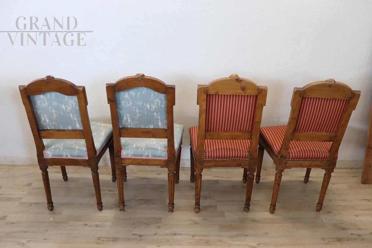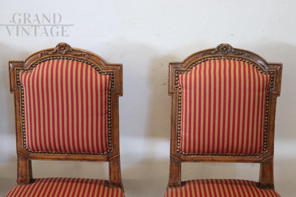 Set di 4 sedie da pranzo antiche di epoca Luigi XVI - XVIII secolo, in legno massello di noce finemente scolpito. Le sedie sono caratterizzate da seduta e schienale imbottiti che le rendono comode e confortevoli. Molto lineari con piccole e raffinate decorazioni intagliate nel legno. In perfetto stato di conservazione del legno e dell’imbottitura, è necessaria però la sostituzione del tessuto soprattutto per una coppia di sedie. Perfette per un tavolo da pranzo importante. Prezzo trattabile.