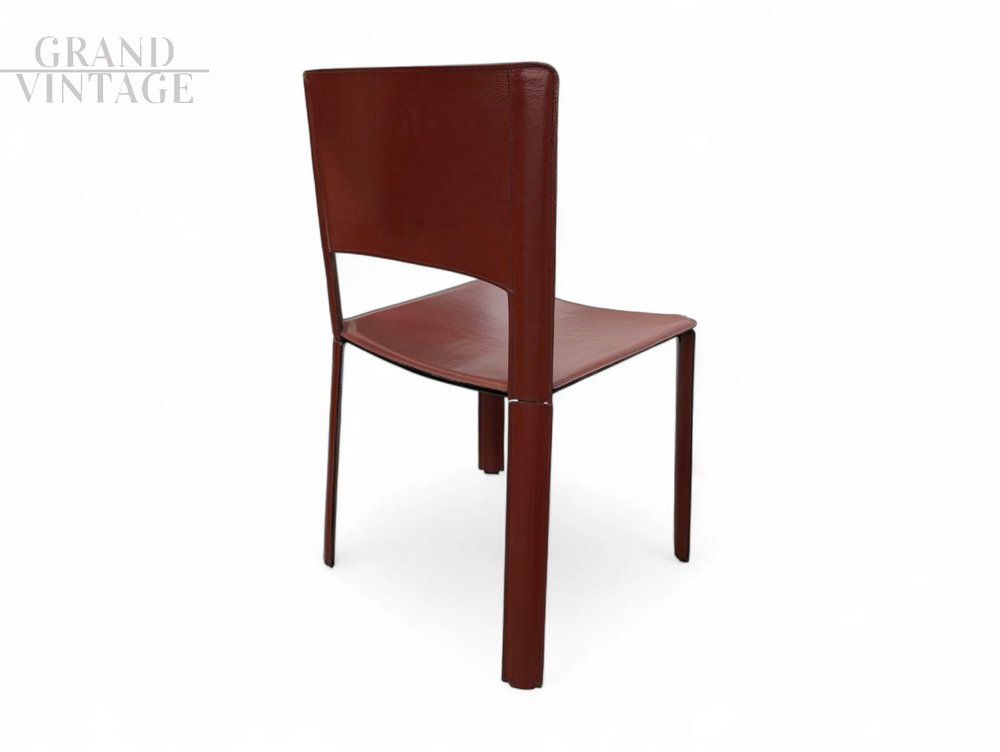 Proponiamo un elegante set di 4 sedie originali Cidue degli anni '70, autentiche espressioni del design italiano modernista. Le sedie si presentano in ottimo stato di conservazione, sia strutturalmente che esteticamente, mantenendo la loro forma originale e il fascino tipico del periodo. Possono presentare lievi segni di utilizzo ma che non rovinano l'impatto visivo ed estetico. Realizzate con struttura interamente rivestita in cuoio rosso bordeaux, queste sedute sono caratterizzate da un design minimalista ma deciso, con linee pulite, profili arrotondati e uno schienale basso con apertura centrale che conferisce leggerezza visiva e comfort. Il cuoio è ben conservato, con una finitura lucida che valorizza l’aspetto retrò e l’alta qualità dei materiali utilizzati.