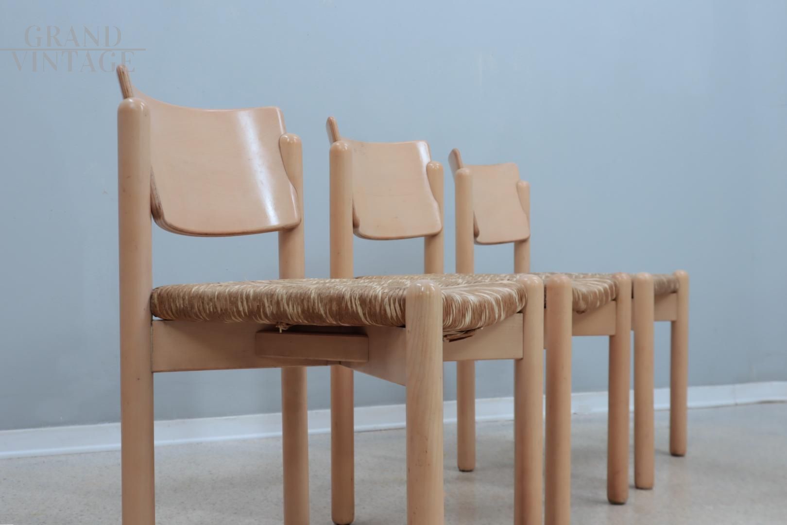 Set originale di 4 sedie da pranzo vintage, dal sapore rustico ma dalla linea raffinata, chiaramente ispirata ai disegni dell'architetto francese Charlotte Perriand e prodotta in Italia negli anni '70 su disegno attribuito a Roberto Pamio e Renato Toso. Le sedie sono realizzate in legno massello di rovere laccato con sedile in paglia intrecciata. Il set è in ottime condizioni vintage coerenti con l'uso e l'età. E' stato effettuato un restauro conservativo, le sedie sono quindi robuste e comode, adatte per l'utilizzo quotidiano, pronte per arredare la vostra casa, studio o ufficio!