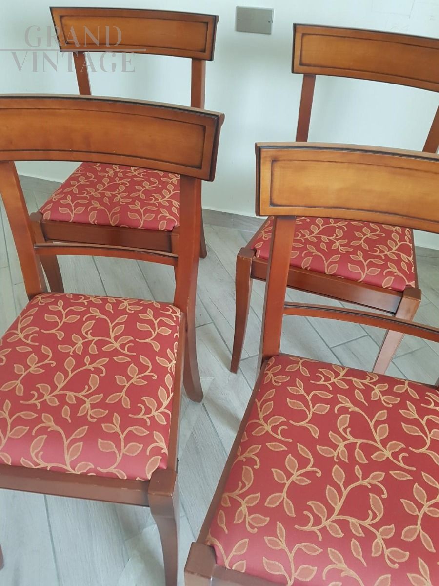 Set di 4 sedie in stile classico realizzate negli anni '70 dall'azienda Grange, in bellissimo legno di ciliegio con seduta imbottita e rivestita in tessuto elegante. In ottimo stato, trattate a cera, presentano piccoli naturali segni del tempo.