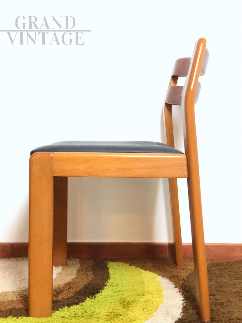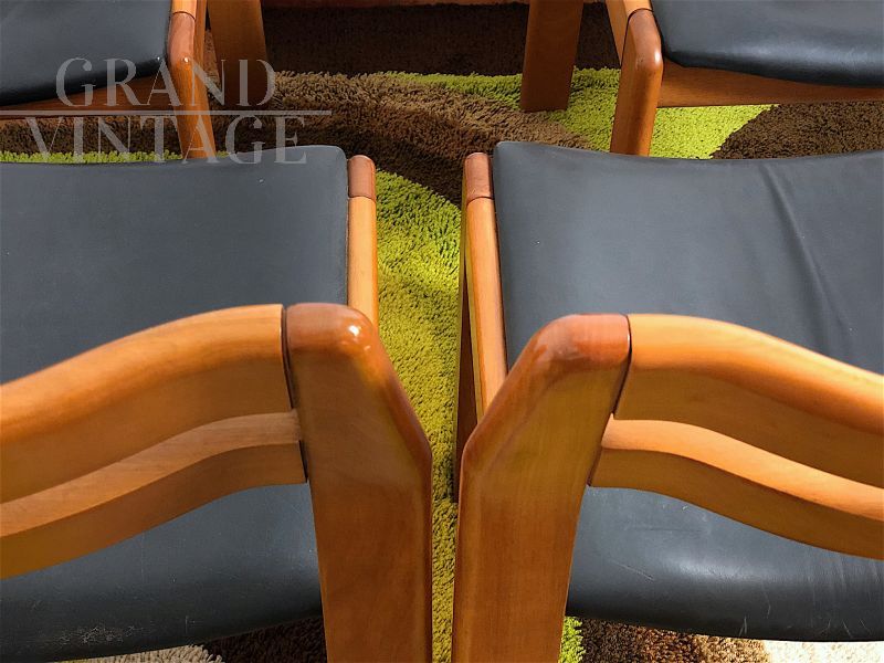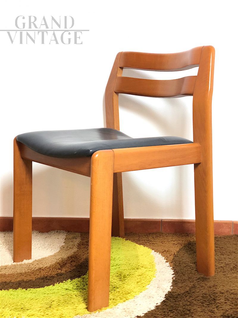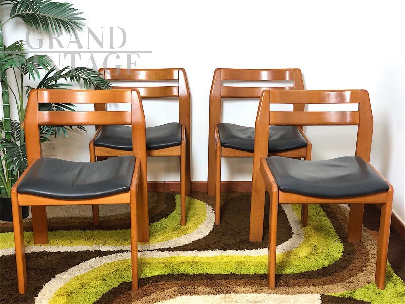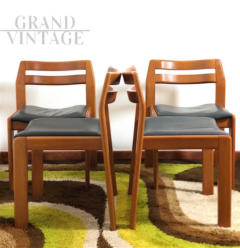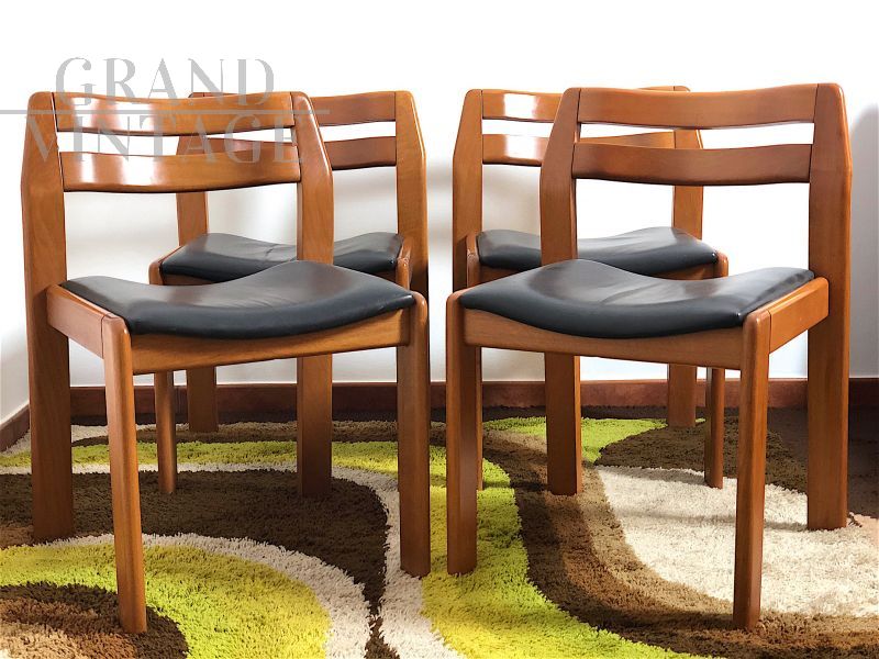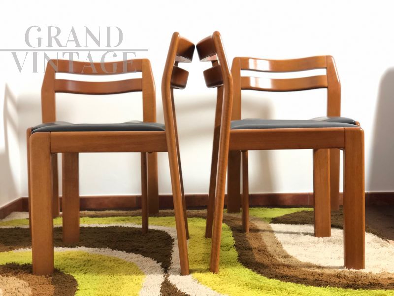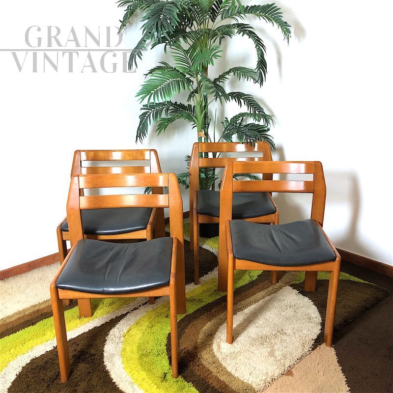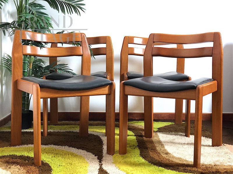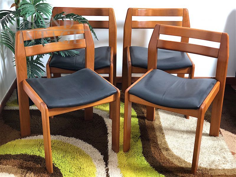 Elegante set di 4 sedie vintage risalenti agli anni '70, realizzate con una solida struttura in legno di noce nazionale e una seduta rivestita in pelle. Il design essenziale riflette l'estetica del modernariato italiano, con linee pulite e materiali di alta qualità. Queste sedie rappresentano un perfetto connubio tra funzionalità e design, rendendole un'aggiunta preziosa per gli appassionati di arredi Vintage. Struttura in legno massello di noce, seduta rivestita in pelle nera. In condizioni perfette.