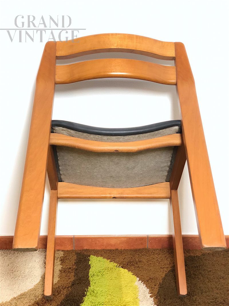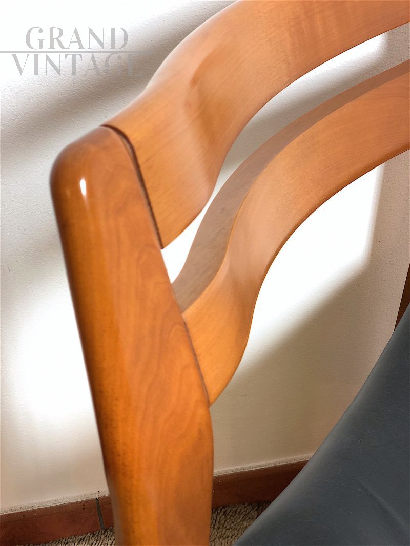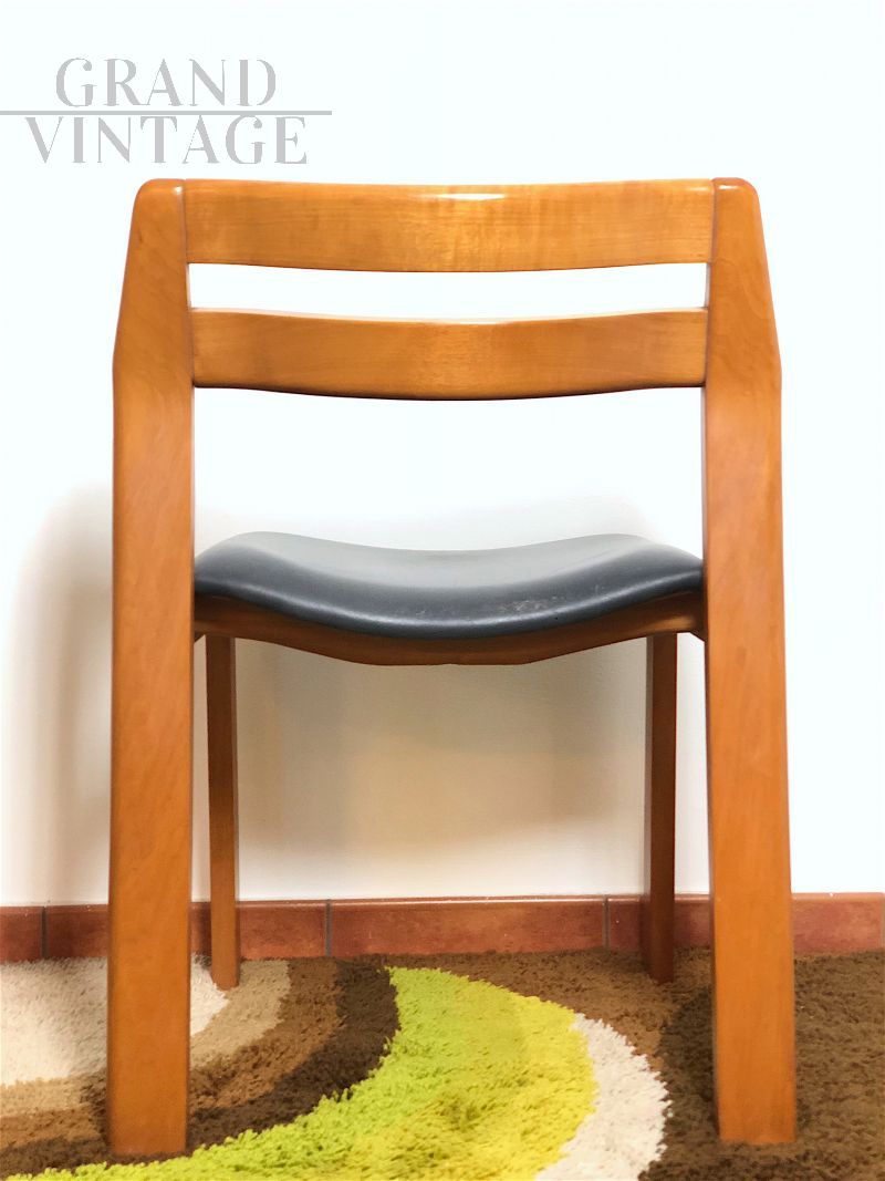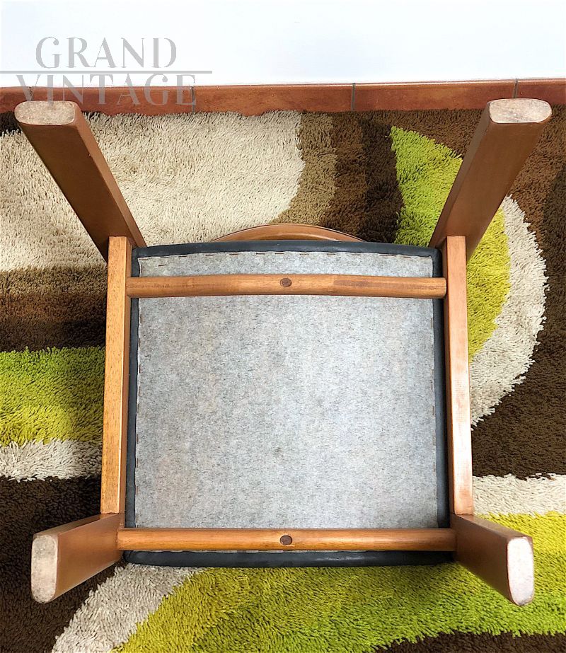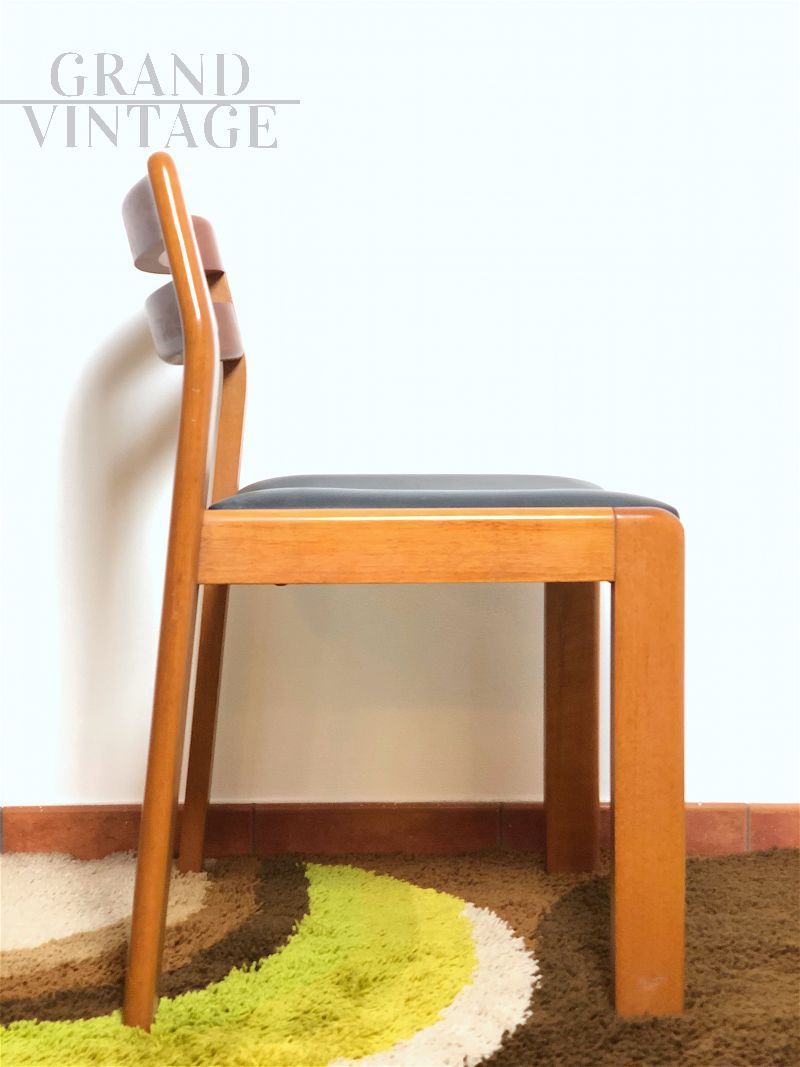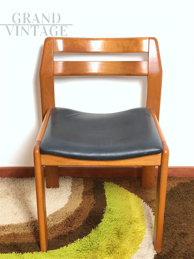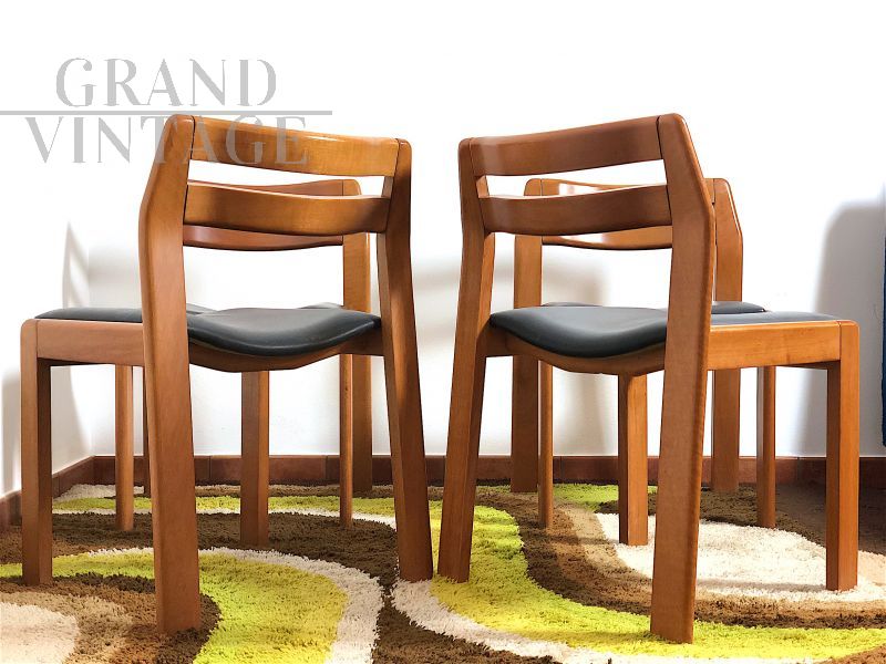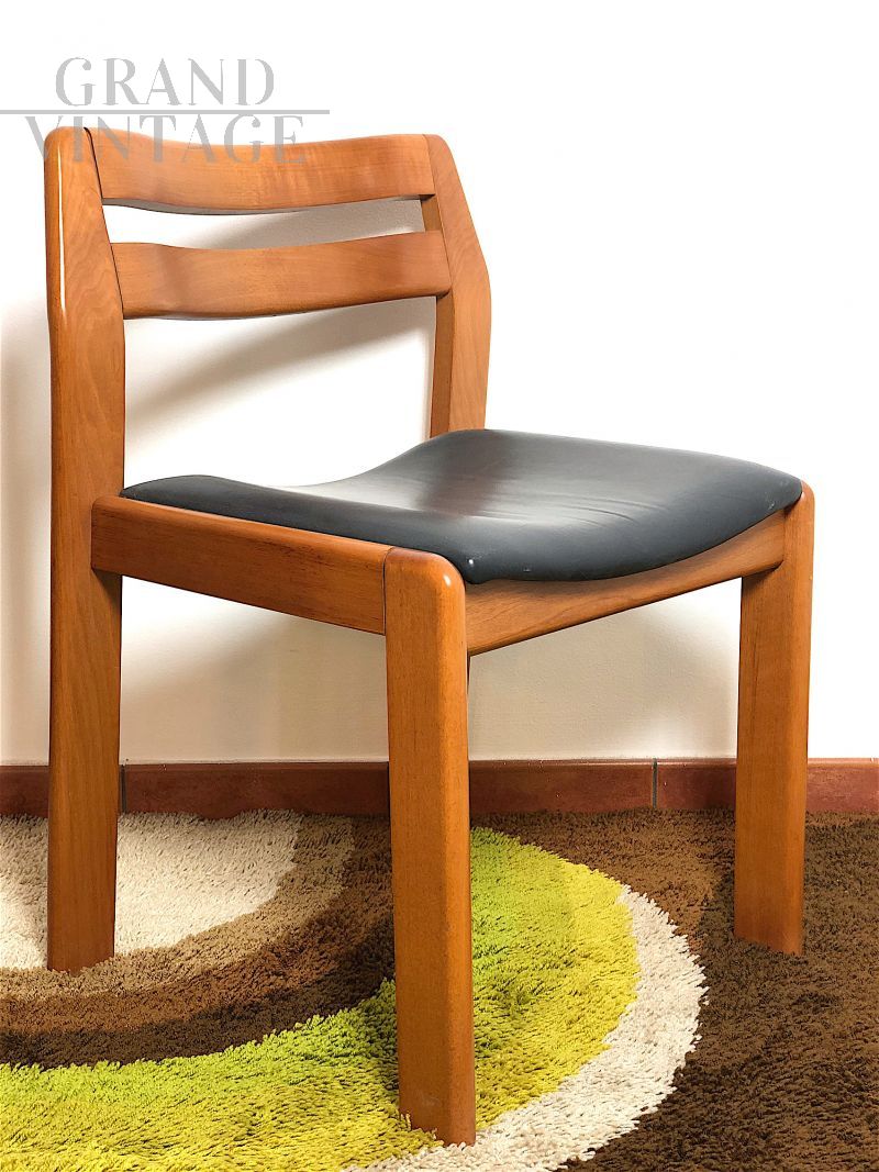 Elegante set di 4 sedie vintage risalenti agli anni '70, realizzate con una solida struttura in legno di noce nazionale e una seduta rivestita in pelle. Il design essenziale riflette l'estetica del modernariato italiano, con linee pulite e materiali di alta qualità. Queste sedie rappresentano un perfetto connubio tra funzionalità e design, rendendole un'aggiunta preziosa per gli appassionati di arredi Vintage. Struttura in legno massello di noce, seduta rivestita in pelle nera. In condizioni perfette.