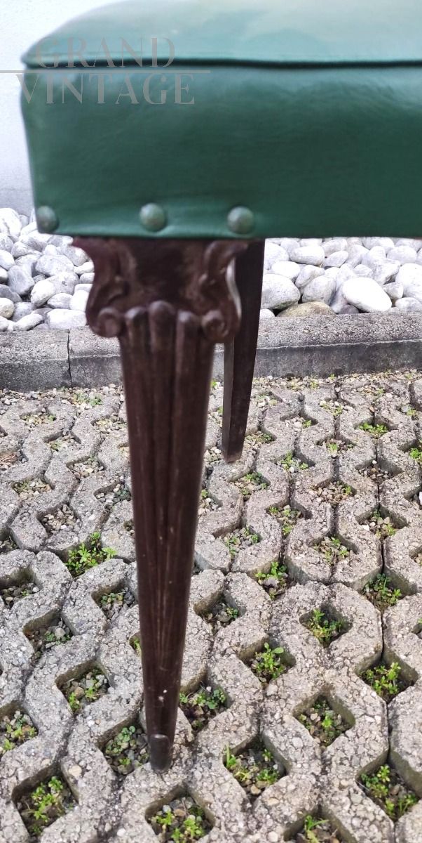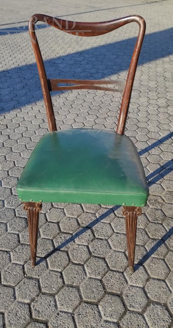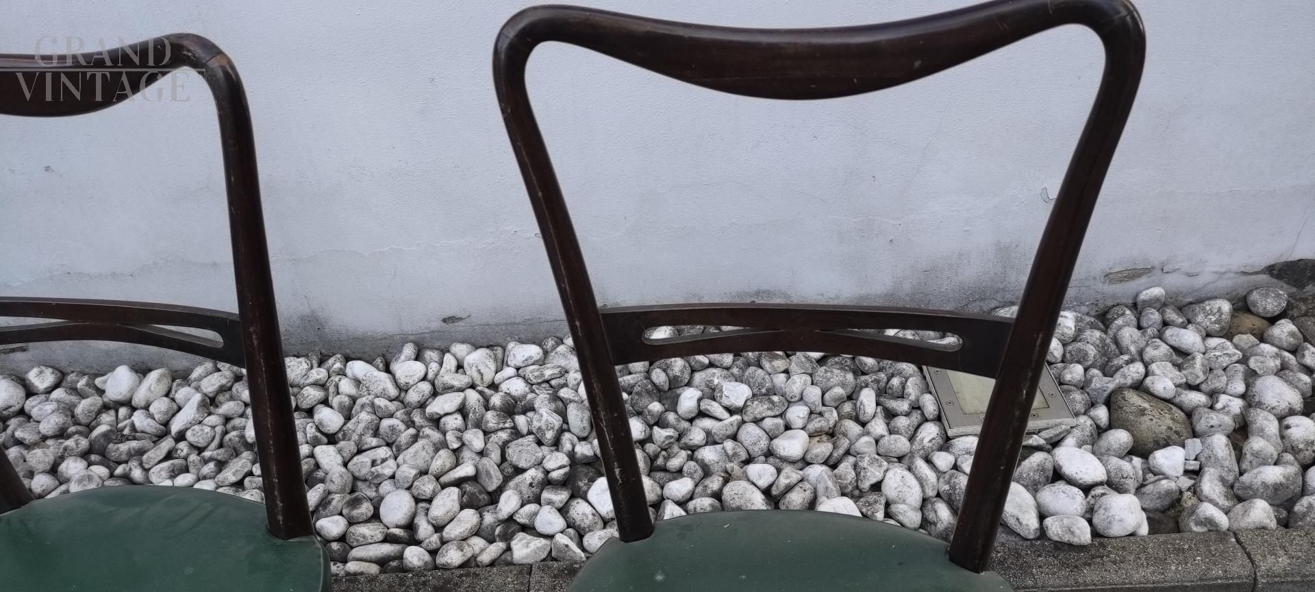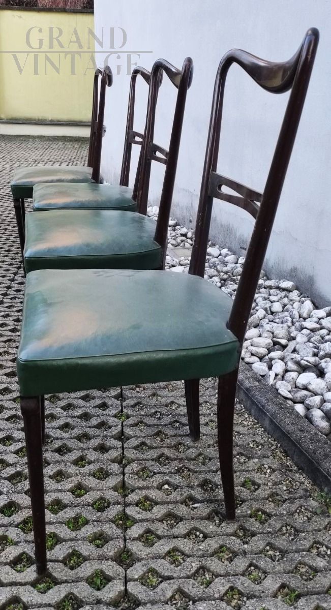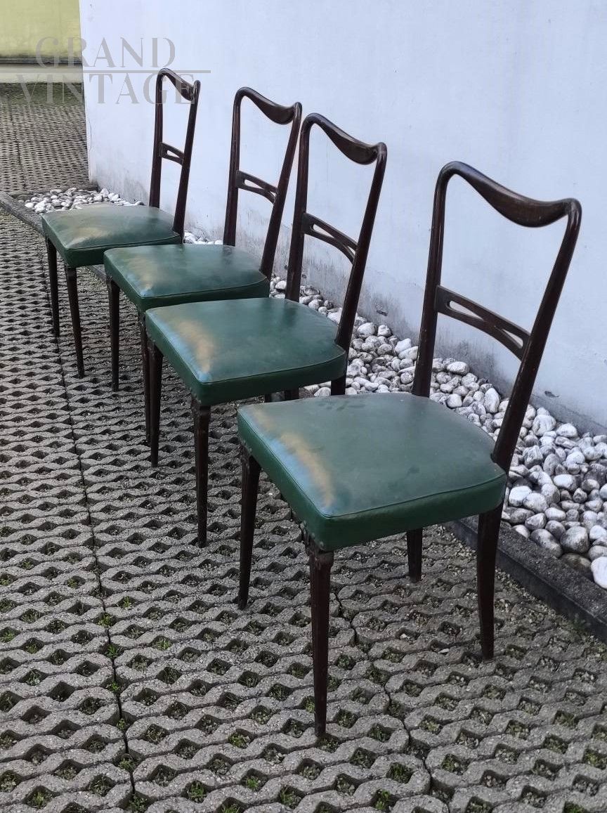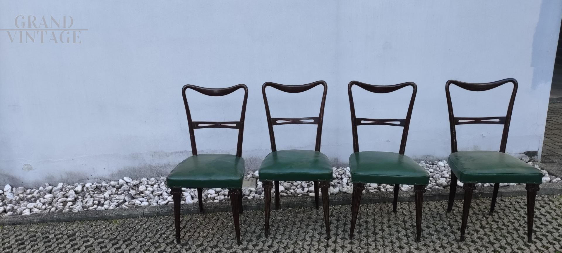 Set di 4 sedie mid-century italiane modello Papillon con struttura in legno di faggio e seduta in similpelle skai verde, le gambe sono elegantemente decorate. Buono stato di conservazione generale.