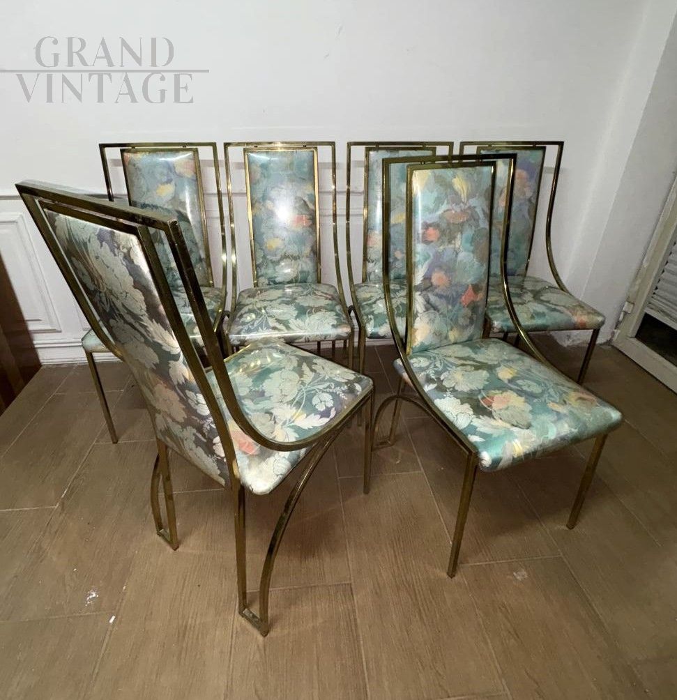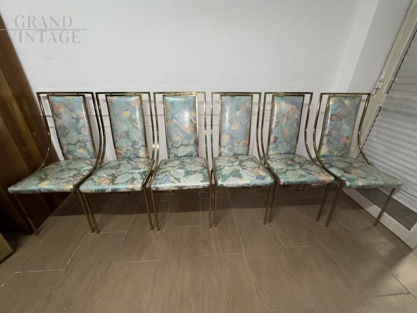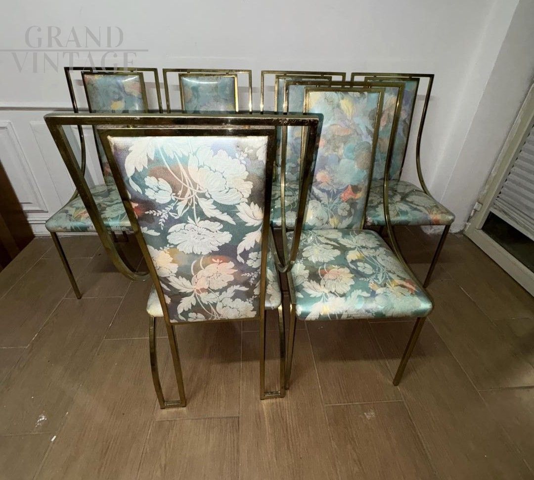 Set di 6 sedie in stile Romeo Rega in ottone e tessuto floreale