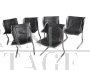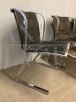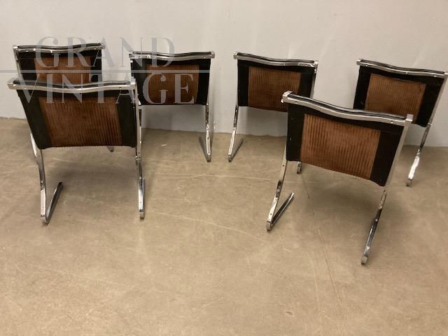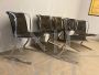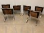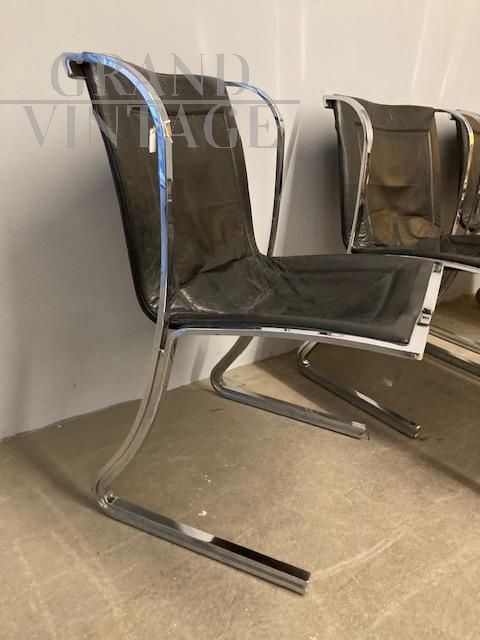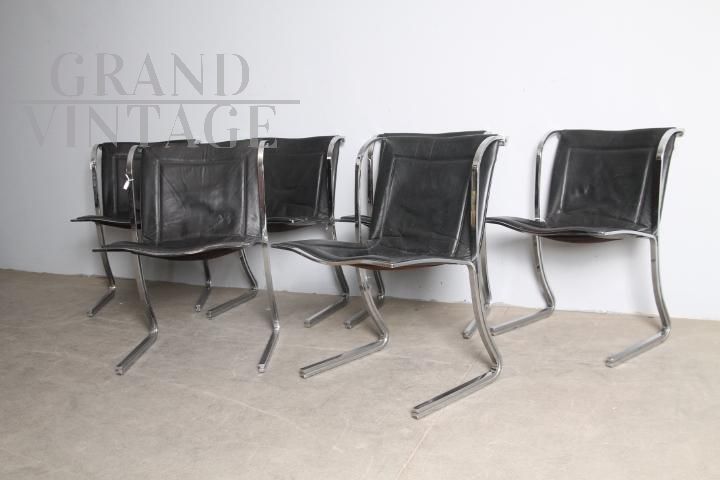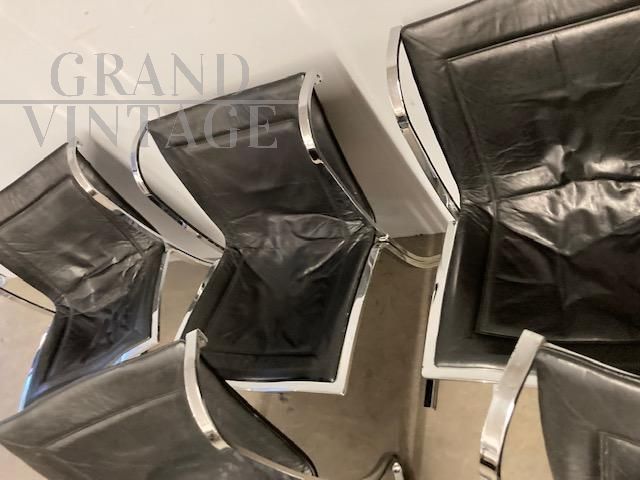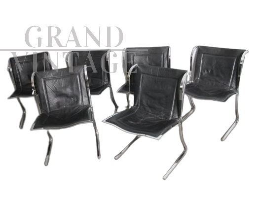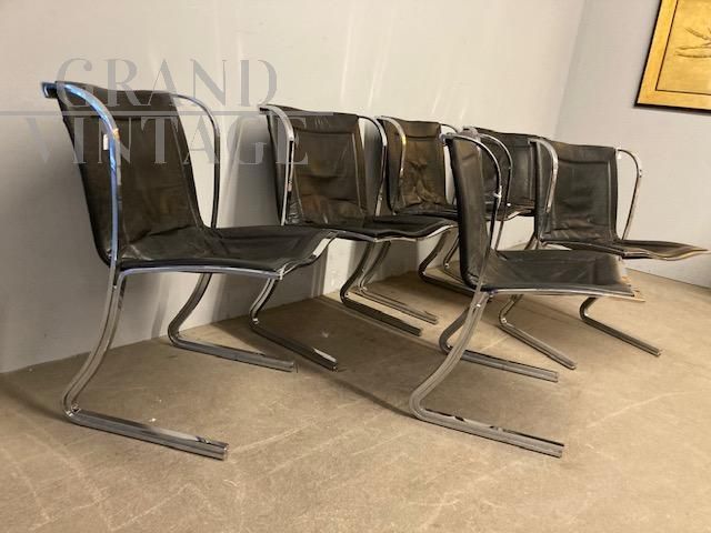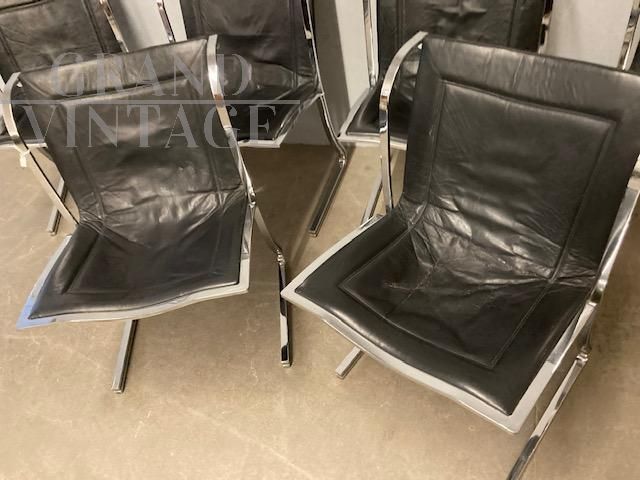 Gruppo di sei sedie modernariato design Fumagalli Milano anni '70 in metallo cromato e cuoio. In buone condizioni, alcune sedute sono state restaurate, le cromature sono state pulite.