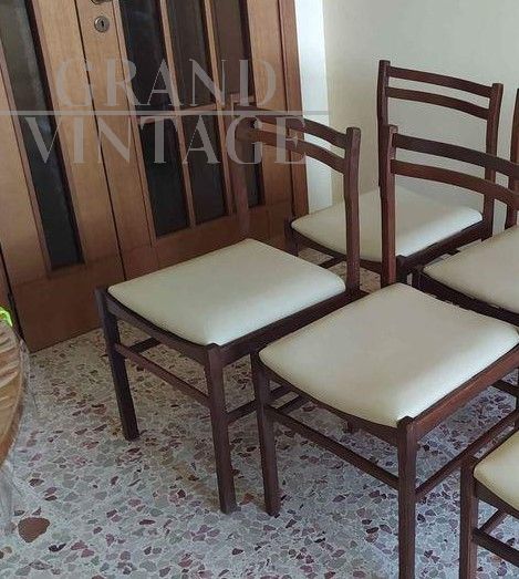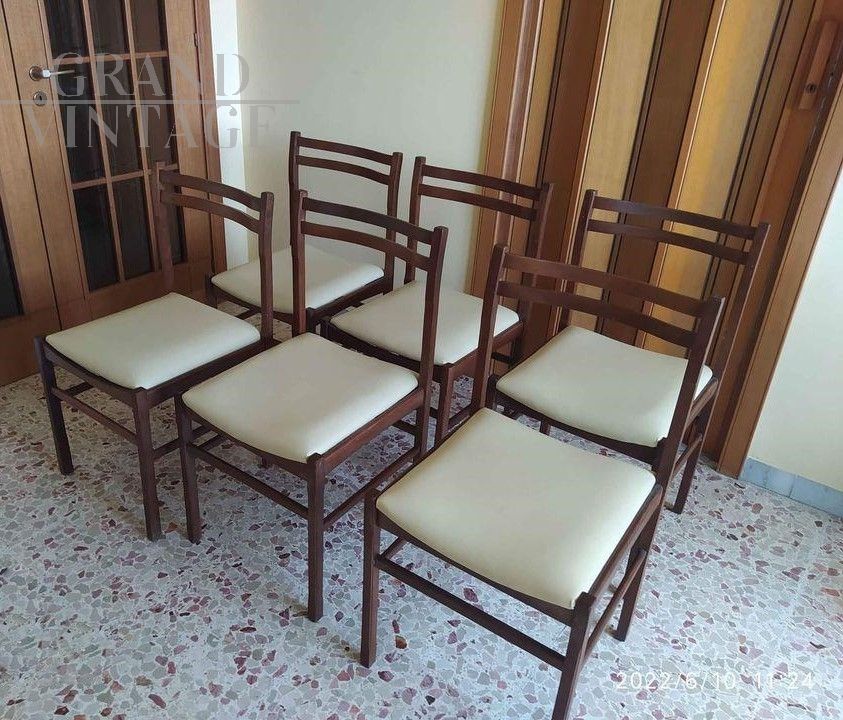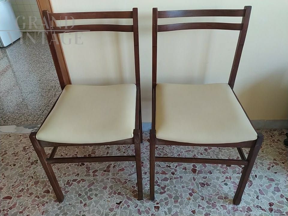 Set di sei sedie da soggiorno vintage anni '70 in legno scuro con seduta imbottita in eco pelle bianco - panna.