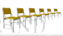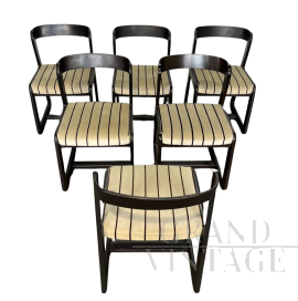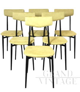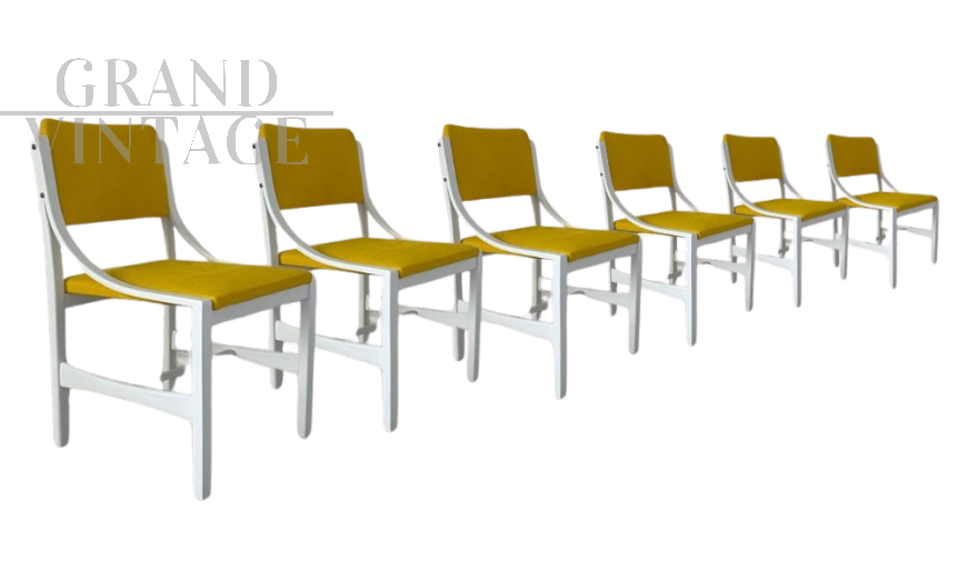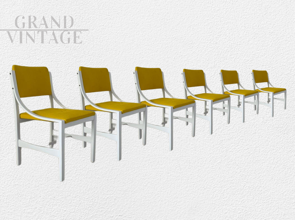 Set composto da 6 sedie di design realizzate intorno agli anni '70 in legno tinto bianco con seduta e poggia schiena imbottiti e rivestiti in tessuto giallo senape. Si presentano in ottime condizioni.