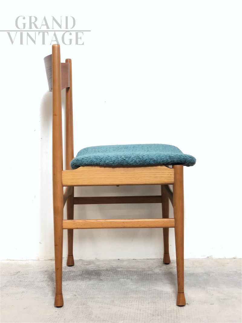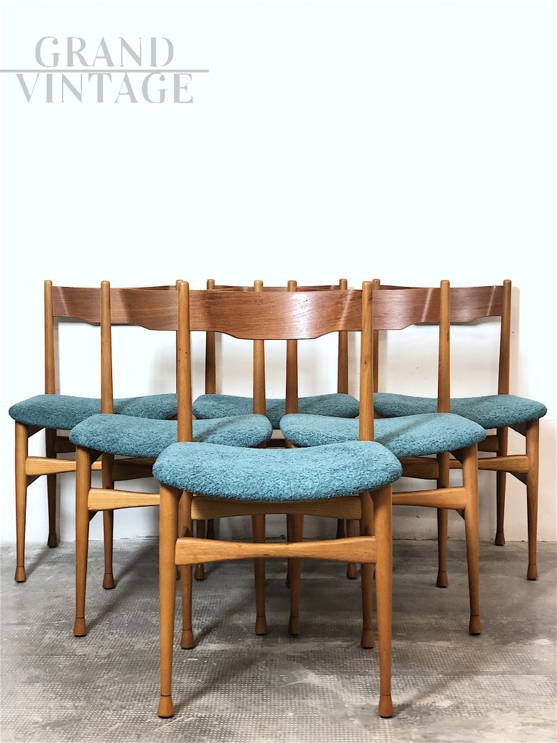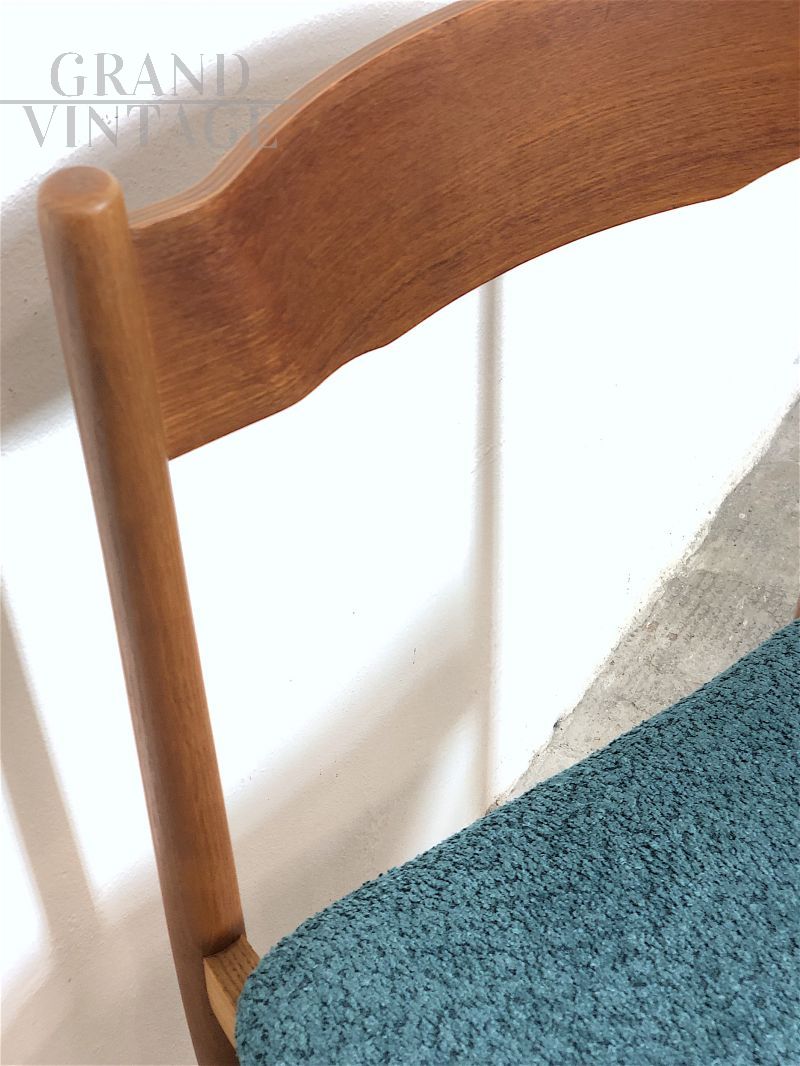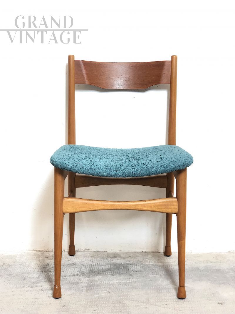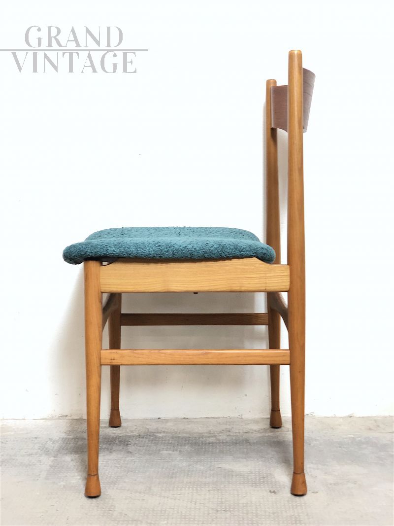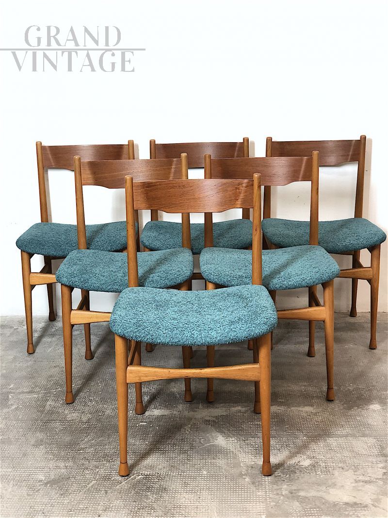 Splendido set di 6 sedie vintage italiane dal gusto scandinavo realizzate negli anni '60 in legno di faggio massello con seduta in materiale espanso rivestita in tessuto ricciolo bouclé Sky Blue. Completamente restaurate, la loro linea strutturale asimmetrica è decisamente futuristica per i canoni degli anni '60. In condizioni perfette.