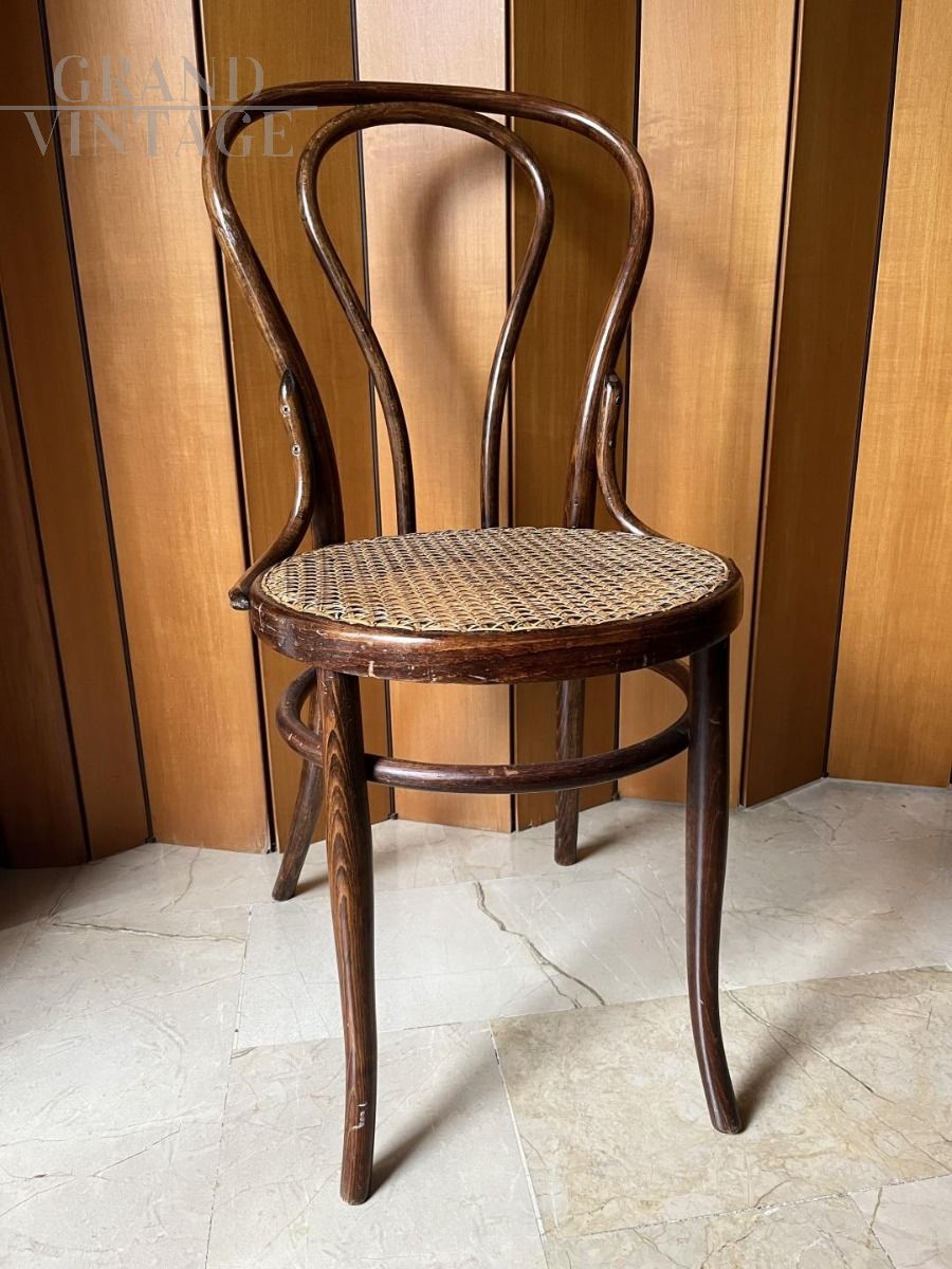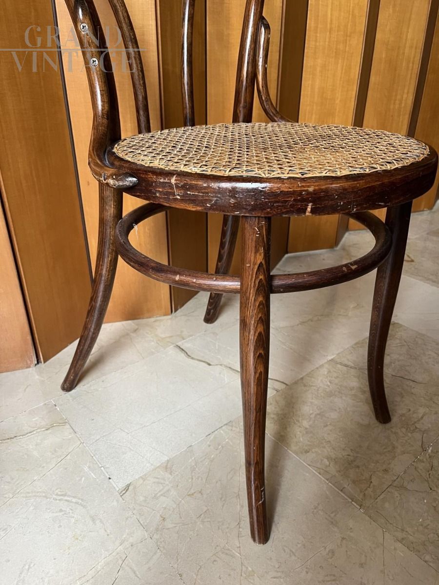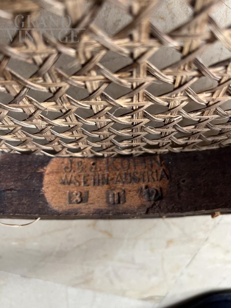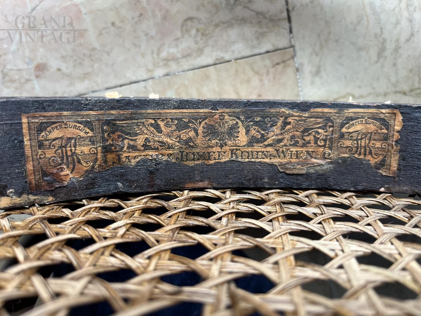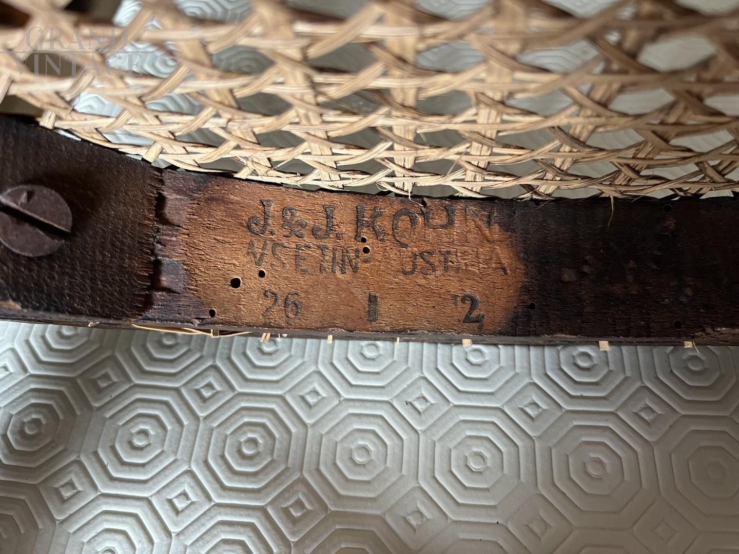 Set di 8 sedie originali prodotte da Jacob & Josef Kohn, Vienna, in legno curvato e finocchino, complete di marchio sotto la seduta. Le sedie presentano normali segni di usura, il finocchino è stato ricostruito seguendo le tecniche originali. Altezza seduta cm 48.