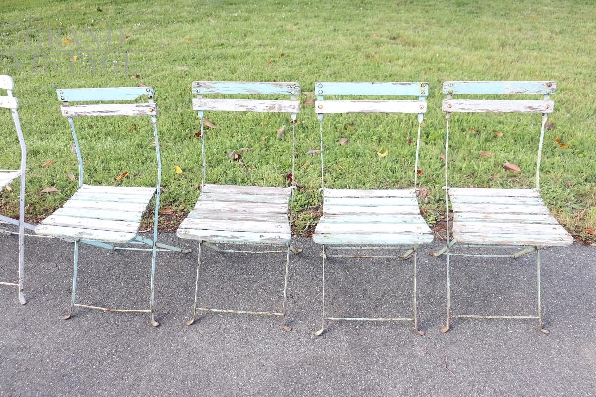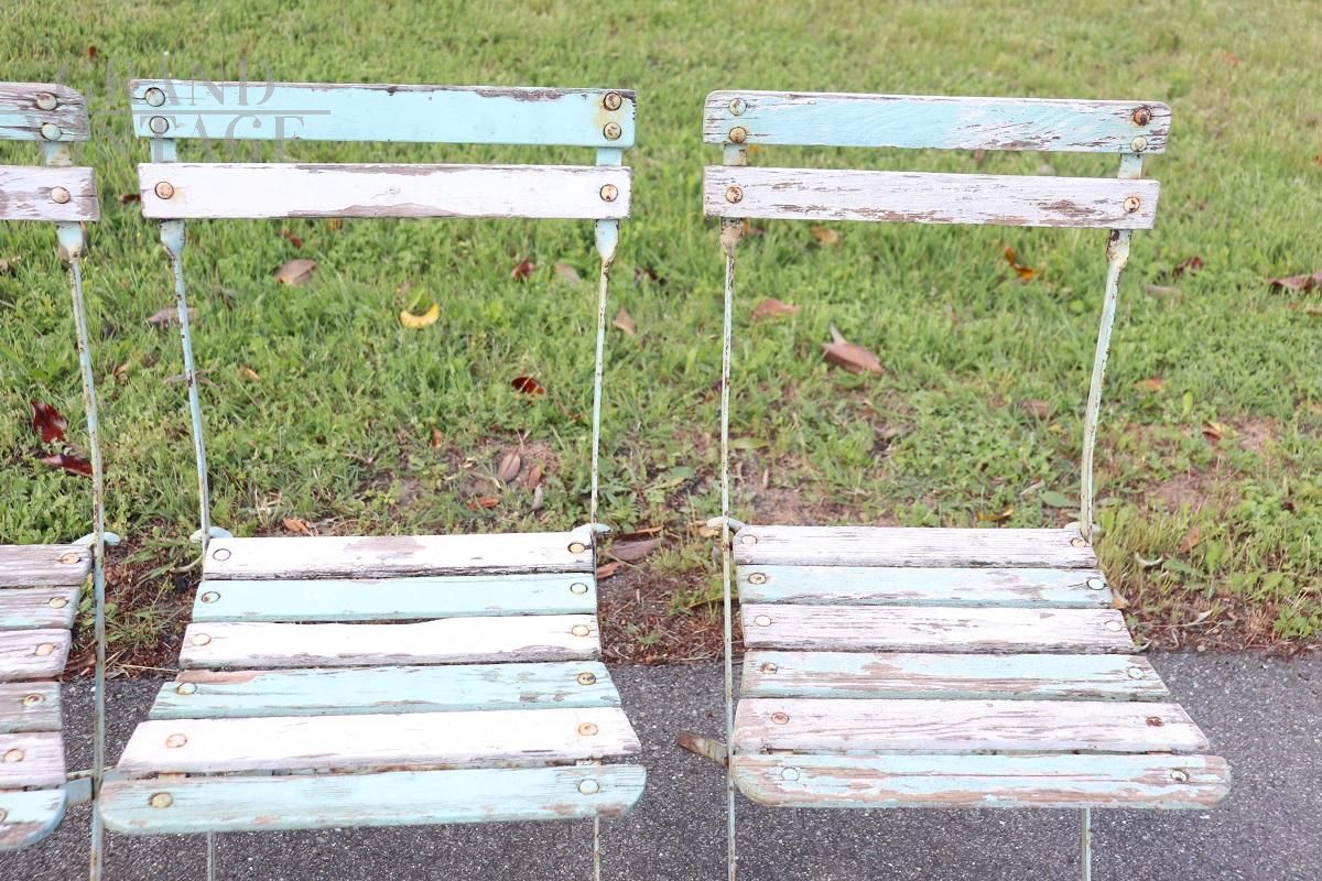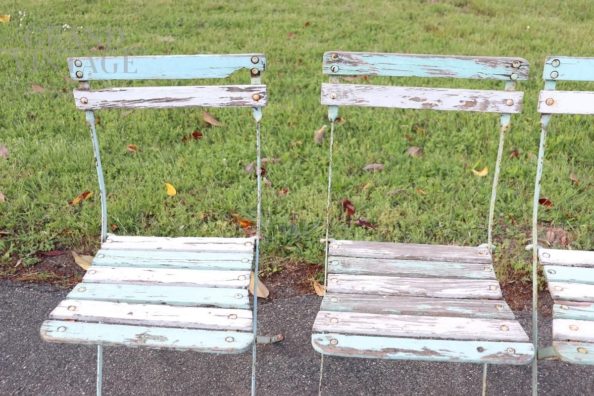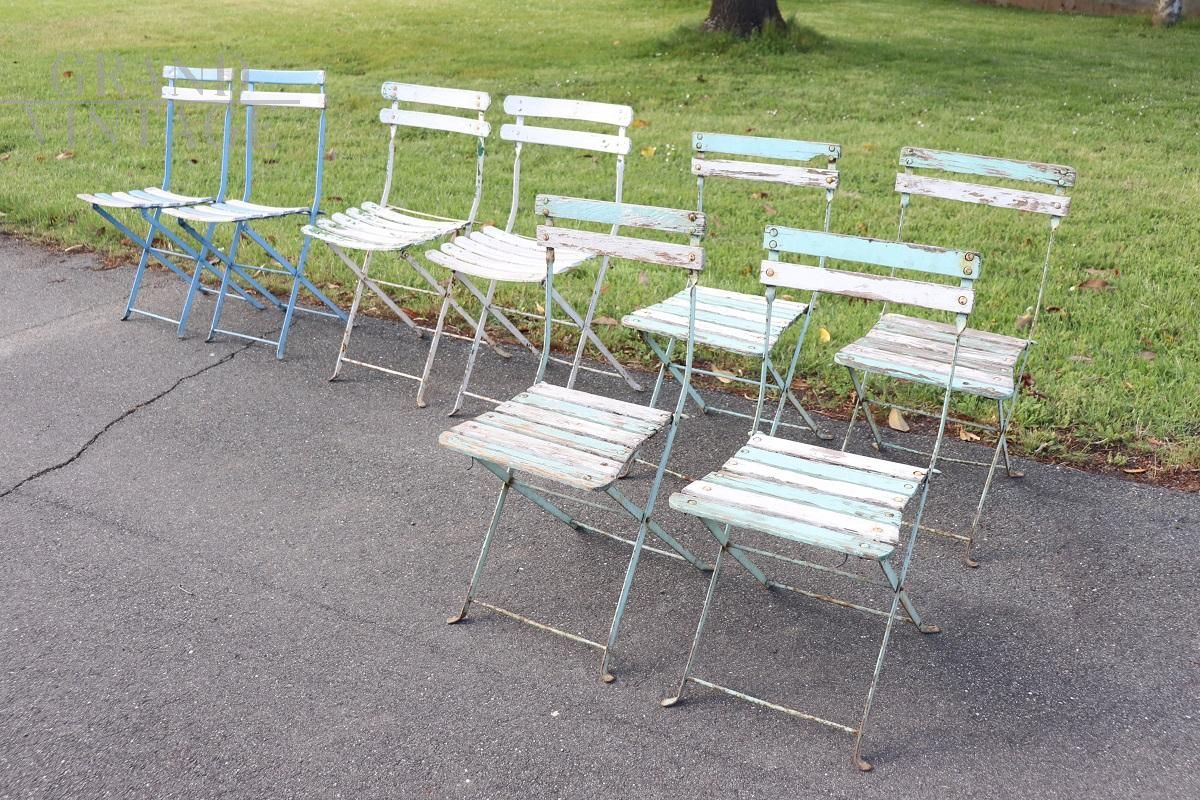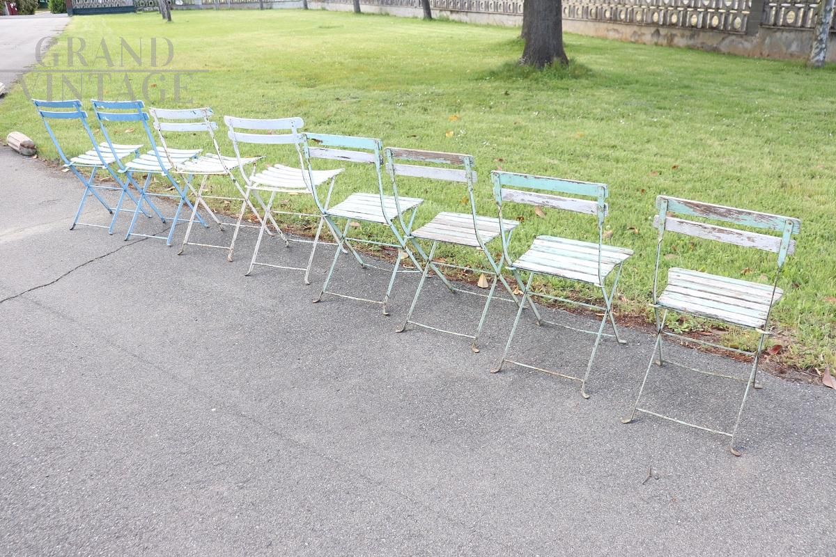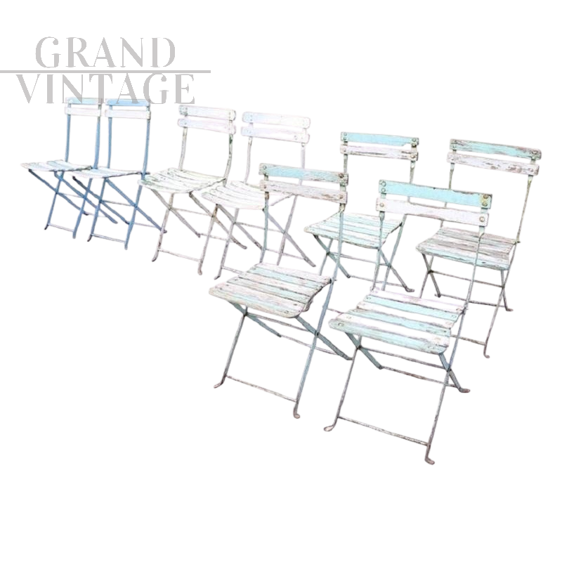 Fantastico set di 8 sedie da bistrot francesi, anni '60 circa, perfette per un arredamento vintage e retrò. La struttura è in ferro mentre le doghe sono in legno di larice; il meccanismo pieghevole consente di spostarle e riporle facilmente quando non vengono utilizzate. Laccate in blu e bianco, sono perfette per essere utilizzate come mobili da giardino o da patio. Le sedie non sono tutte della stessa dimensione e presentano diversi segni di usura, si prega di guardare tutte le foto. Si prega di notare che i segni di usura sono solo estetici e non influiscono sulla stabilità. Abbiamo deciso di presentarle nelle loro condizioni originali vintage perché crediamo che questo aspetto dell'usura accentui il loro fascino retrò.