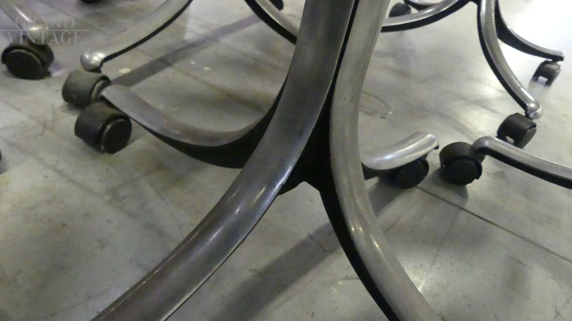 Gamba in metallo che si dirama sfociando in 4 piedi con le rotelle.