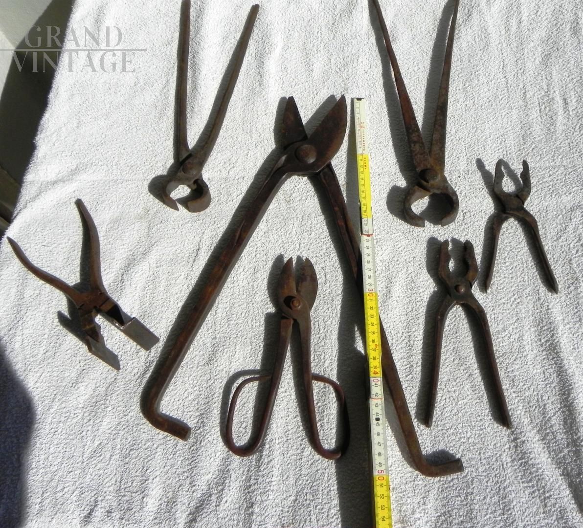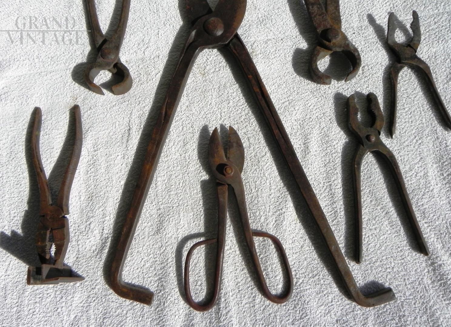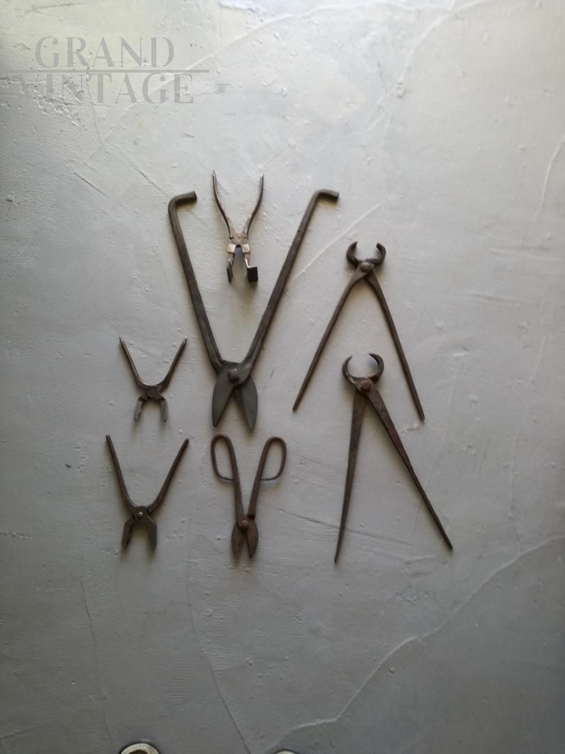 Set di attrezzi da fabbro antichi composto da 7 forbici e tenaglie da forgia anni '40, di varie tipologie e misure. Quella indicata è la misura dell'oggetto piu' grande. Le condizioni sono buone, c'è presenza di ruggine, ma gli oggetti sono tutti utilizzabili, provengono da un'officina da fabbro degli anni '40 / '50.