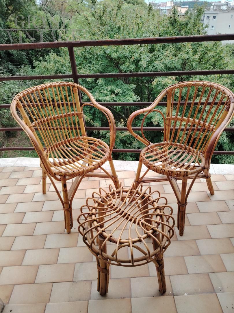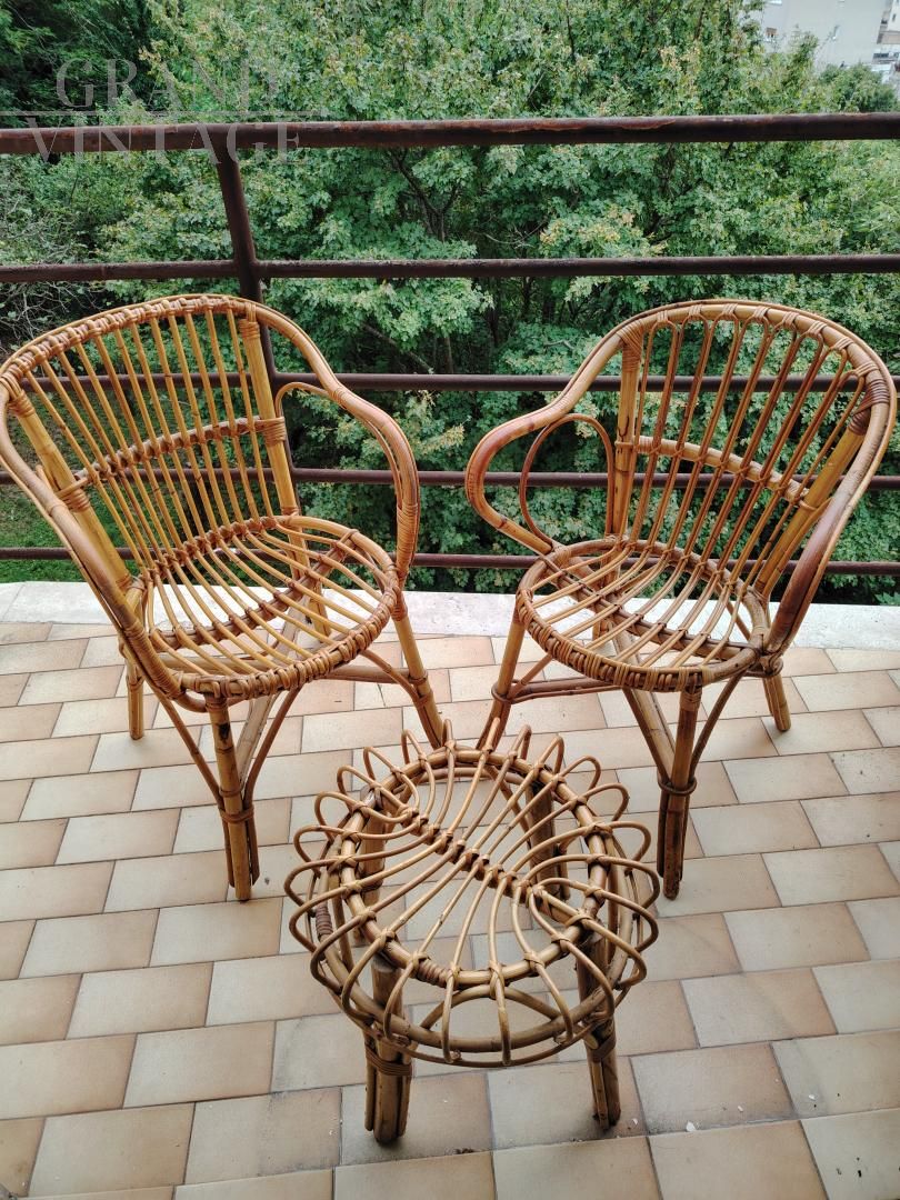 Grazioso salottino da giardino vintage composto da due poltrone e un tavolino in bamboo e vimini intrecciato.