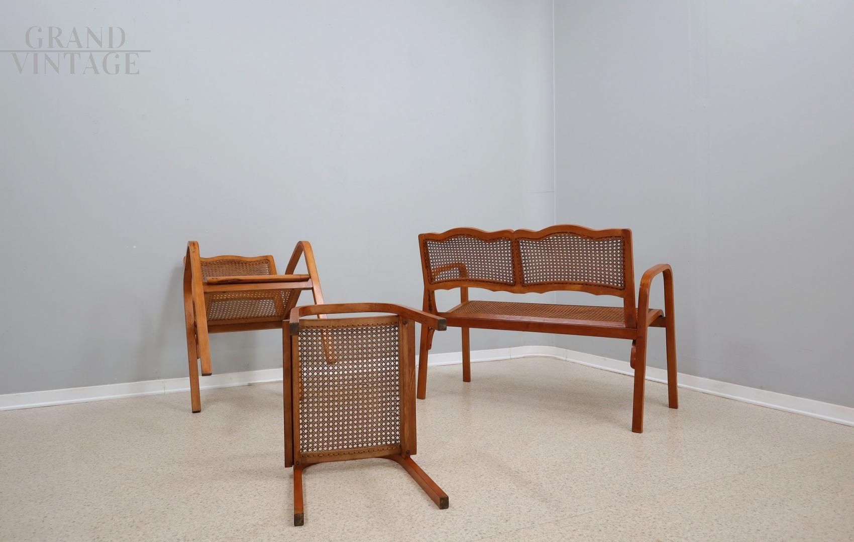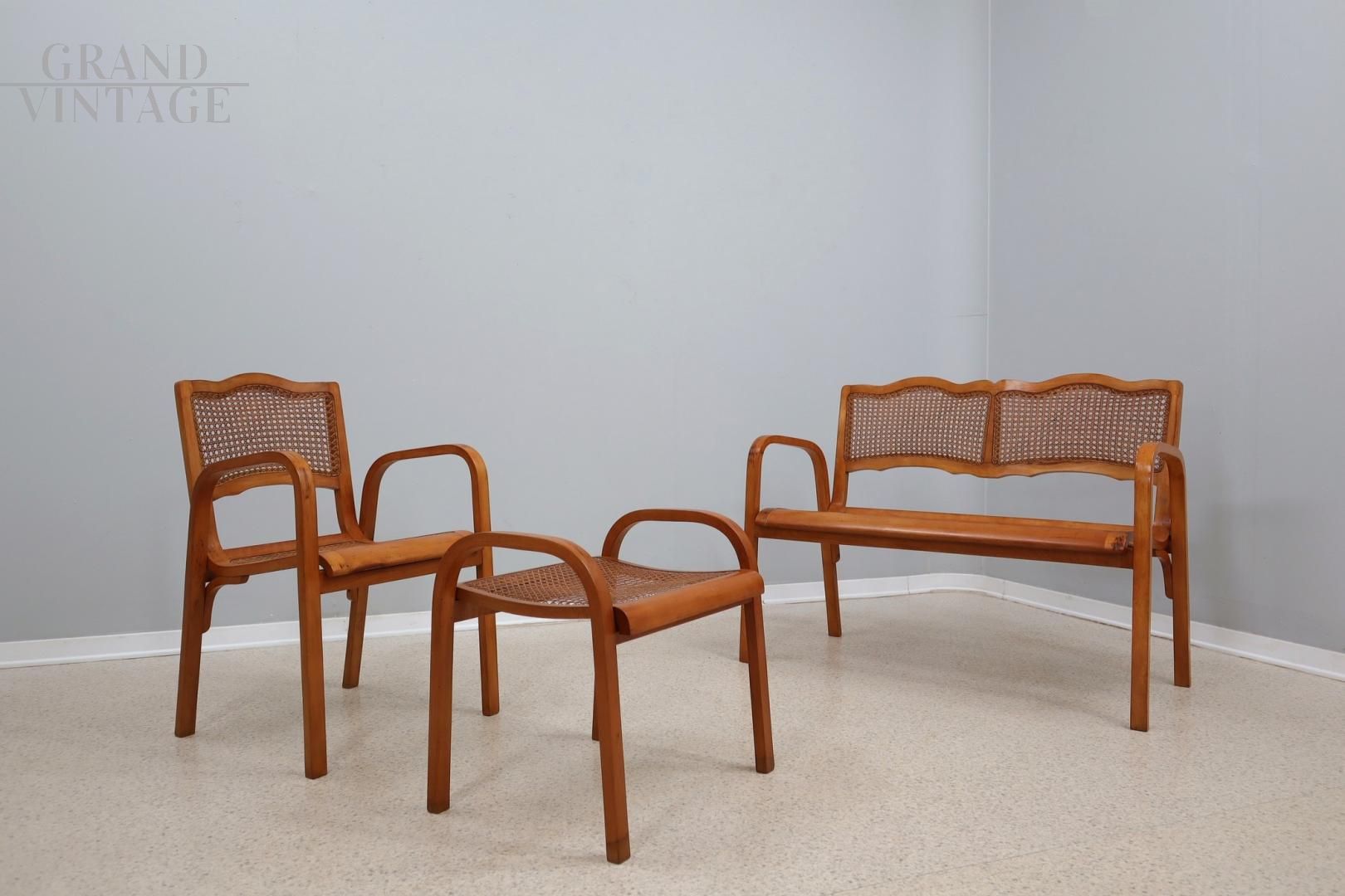 Elegante set in paglia di Vienna degli anni '40 composto da un divanetto da 2 posti e una poltrona con poggiapiedi. Il set è realizzato in acero biondo curvato e lavorato a mano con sedute e schienali originali in paglia di Vienna, presenta dettagli raffinati e un'eccellente fattura. Il set si presenta in ottime condizioni, dopo un restauro conservativo. È robusto e confortevole, pronto per arredare tutti i vostri spazi abitativi!