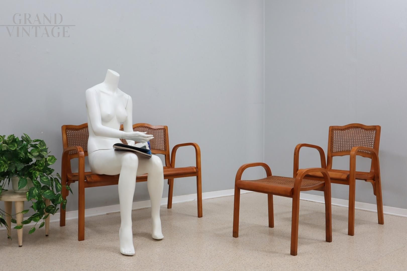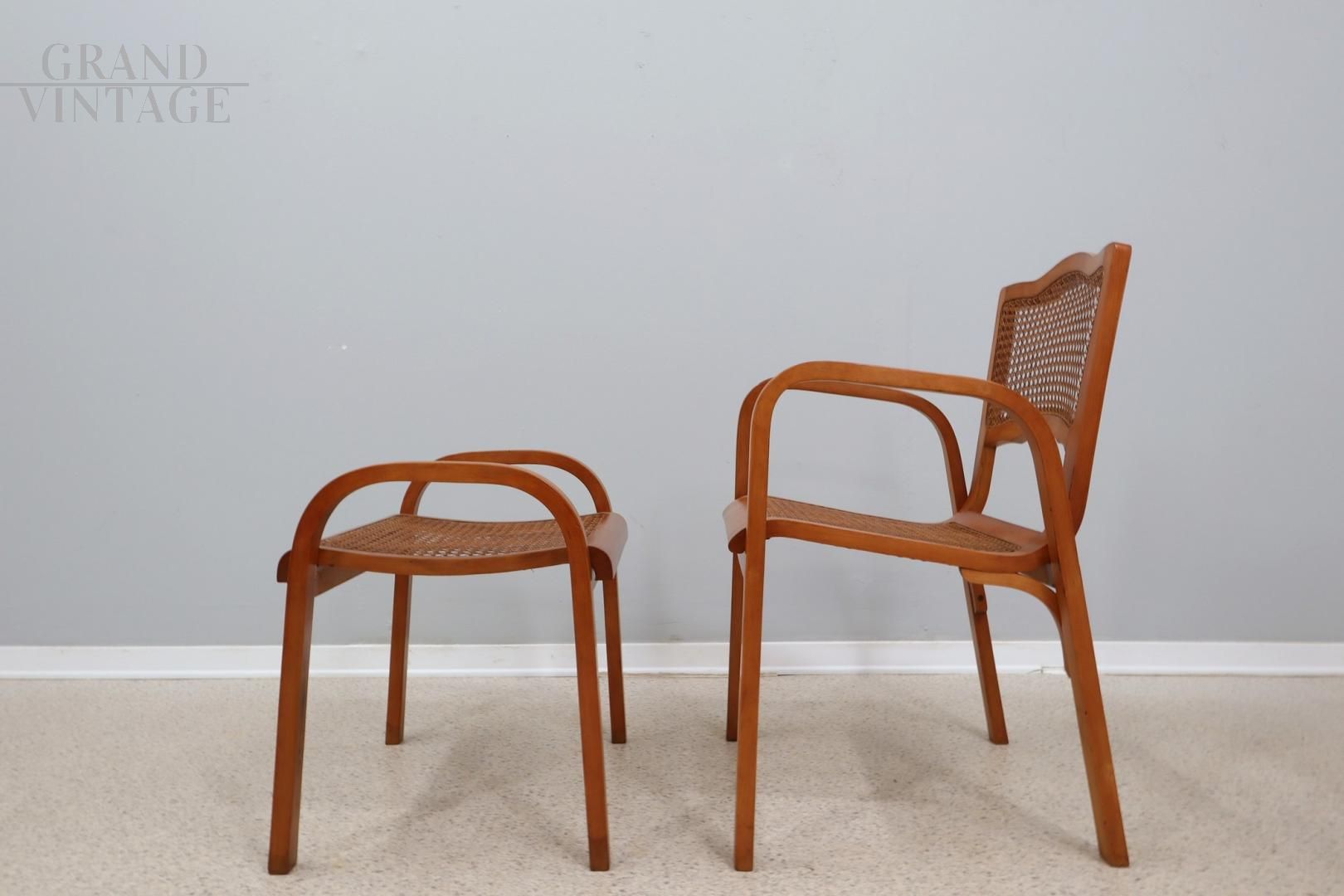 Set di panca e poltrona in paglia di Vienna degli anni '40