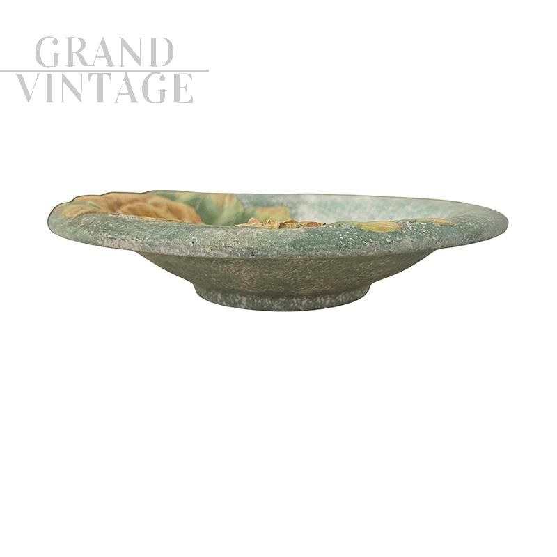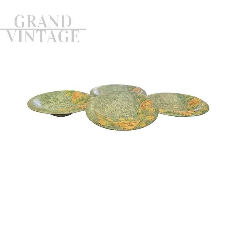 Set di quattro piatti liberty in ceramica decorata con motivi floreali di rose gialle su fondo verde, diametro 22 cm. Italia, XX secolo.