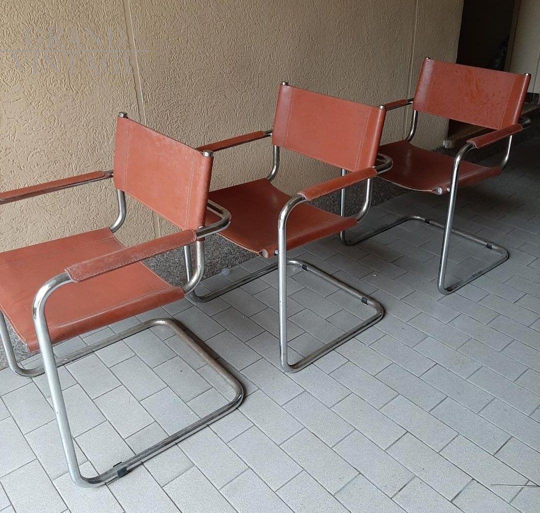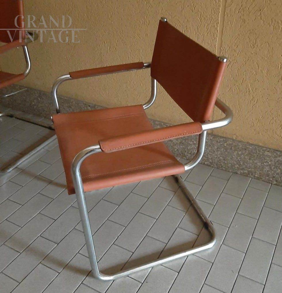 Quattro poltroncine cantilever Bauhaus di Mart Stam in cuoio marrone, con la classica struttura in acciaio con braccioli.