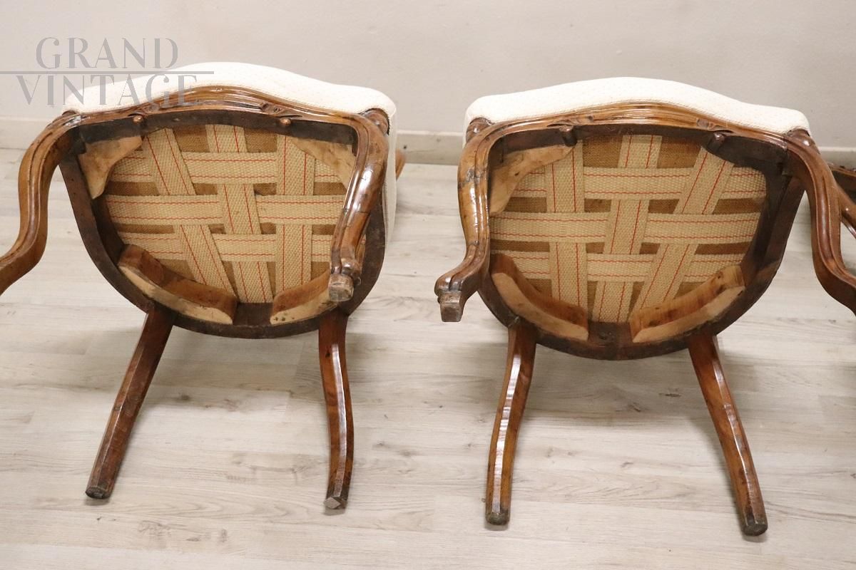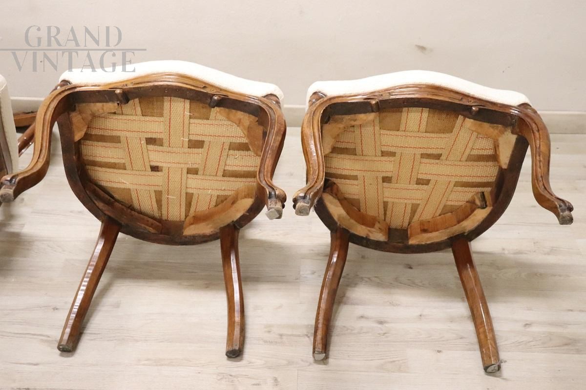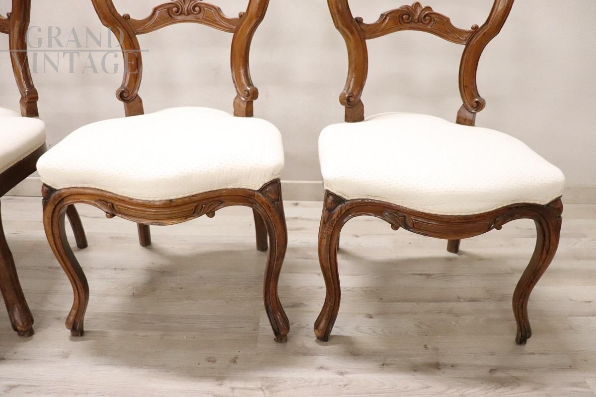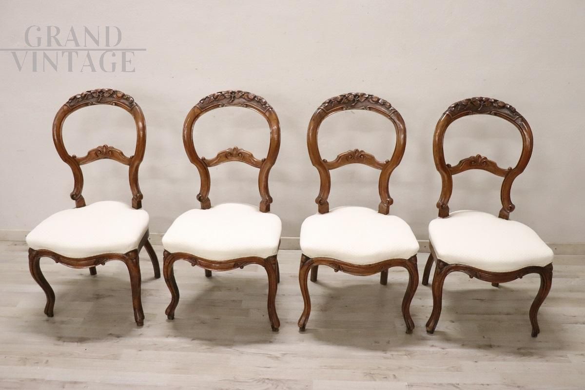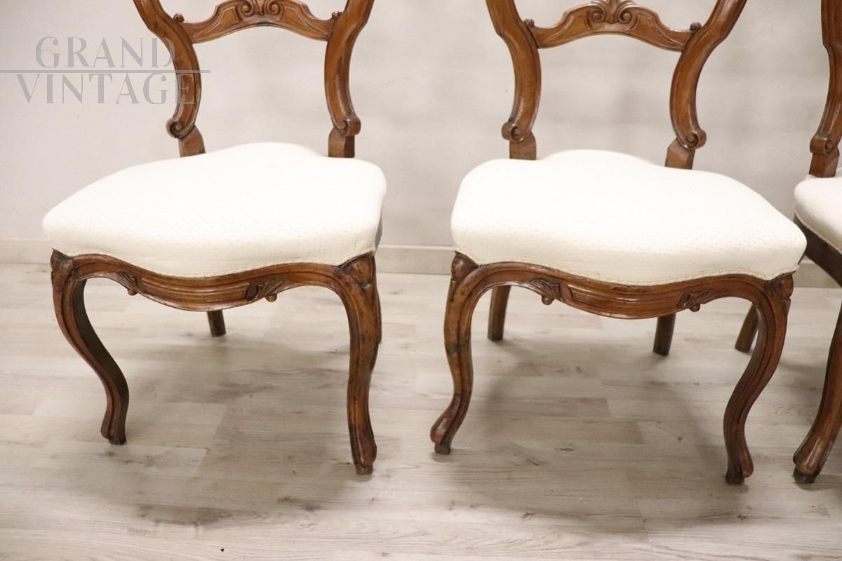 Splendido set di quattro sedie antiche italiane del periodo Luigi Filippo, risalenti alla metà del XIX secolo. Queste squisite sedie sono caratterizzate da una robusta struttura in noce massello. Lo schienale è progettato con una forma graziosamente ondulata, impreziosita da intricati intagli in legno di foglie e motivi floreali, che aggiungono un tocco raffinato. L'ampia seduta imbottita assicura il massimo comfort. Le gambe anteriori presentano un design sinuoso e ondulato, mentre quelle posteriori sono elegantemente sagomate nel classico stile a sciabola. Si noti che il tessuto dei sedili presenta alcune macchie (come illustrato nelle foto di accompagnamento). Prezzo trattabile.