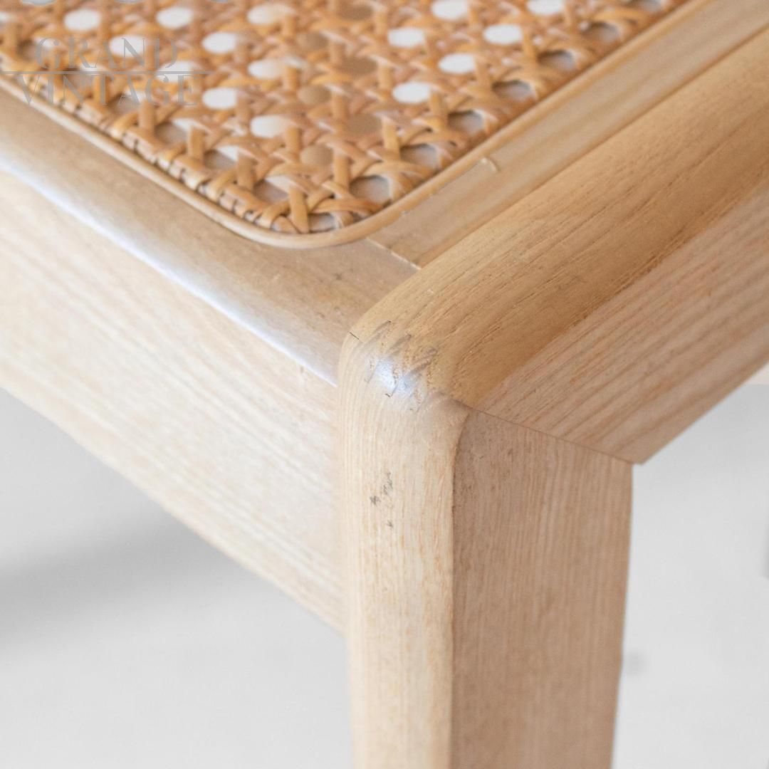 Set di Quattro Sedie Italiane in Rovere e Paglia di Vienna, Anni '70 Elegante set di quattro sedie da pranzo realizzate in Italia negli anni ’70, con struttura in legno massello di rovere e seduta in pregiata paglia di Vienna intrecciata a mano. Le linee essenziali e l'uso di materiali naturali conferiscono alle sedie un fascino senza tempo, perfetto per ambienti che spaziano dallo stile rustico moderno al minimalismo raffinato. La finitura del legno esalta la bellezza della venatura del rovere, mentre l’intreccio artigianale della seduta in paglia di Vienna aggiunge un tocco di leggerezza ed eleganza. Le sedie sono state rifinite professionalmente e si presentano in ottime condizioni strutturali ed estetiche.