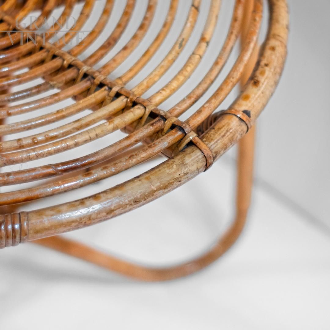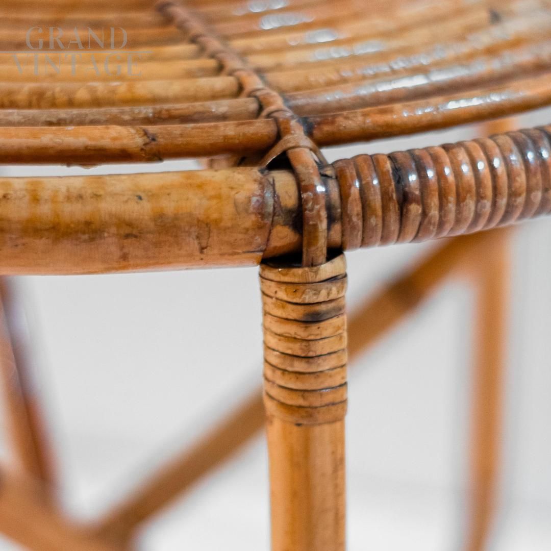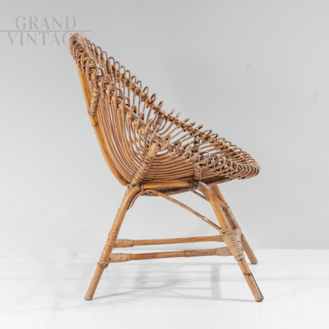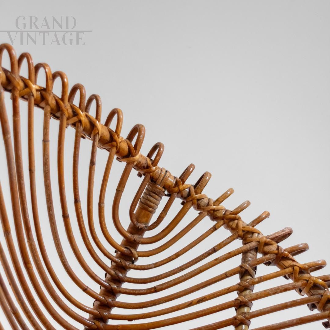 Un set da salotto o da giardino in bambù splendidamente realizzato in Italia negli anni '60. Comprende una poltrona bassa e un tavolino abbinato, entrambi in grado di esaltare l'eleganza e la versatilità del bambù lavorato a mano. La poltrona presenta un design aperto e scultoreo, con doghe di bambù elegantemente curve disposte a ventaglio, che offrono comfort e leggerezza visiva. Il tavolo abbinato presenta un piano circolare intrecciato e gambe dinamiche a X, a dimostrazione della raffinata artigianalità e dell'attenzione ai dettagli tipiche del design italiano di metà secolo. Recentemente rifinito, il set si presenta in eccellenti condizioni, senza danni, pronto per valorizzare sia gli spazi interni che quelli esterni coperti.