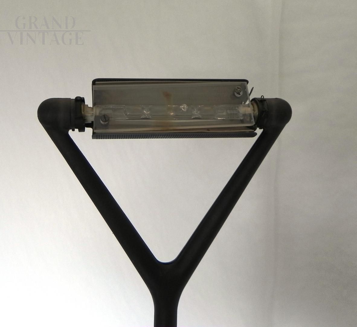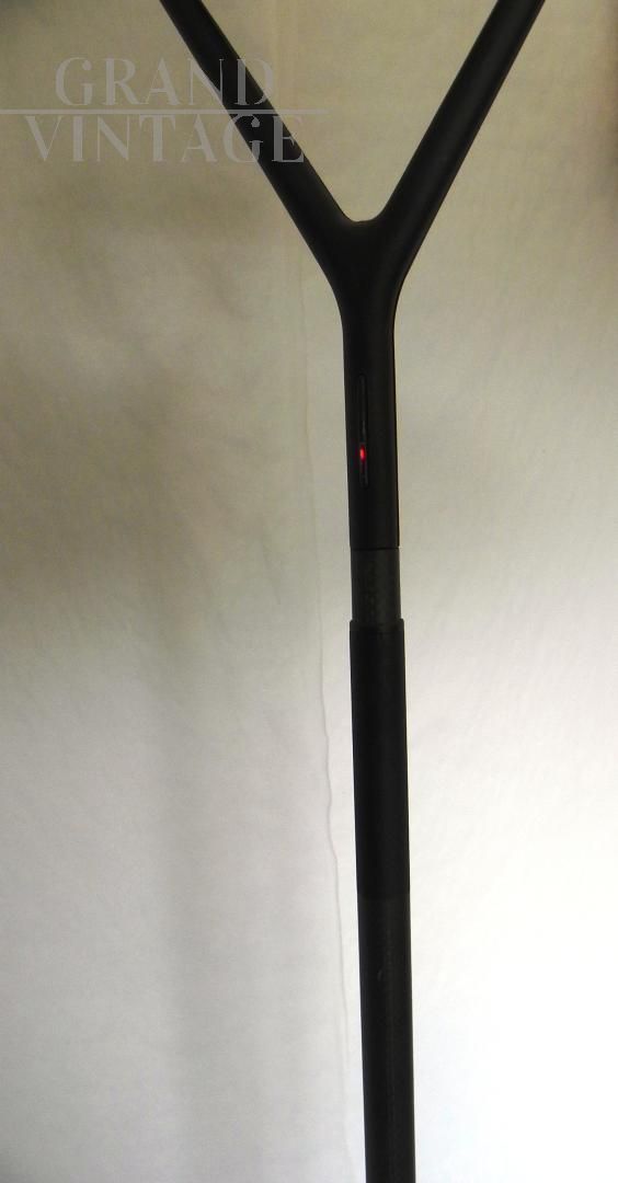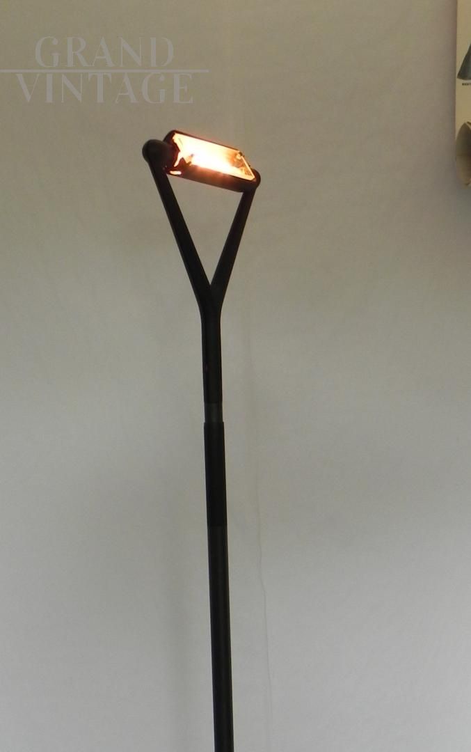 lampada a stelo piantana modello Lola di Luceplan, anni '80. La lampada a stelo è regolabile in altezza da 160 a 200 cm, ha una luminosità regolabile in 4 intensità grazie a un interruttore dimmer a pedale, e ha anche un piccolo pulsante luminoso sullo stelo. La piantana è usata, porta quindi i naturali segni d'uso, visibili in foto.. le luce e' orientabile in senso verticale munita di lampada alogena 150 w, ma si può montare anche una lampada a led delle stesse misure.