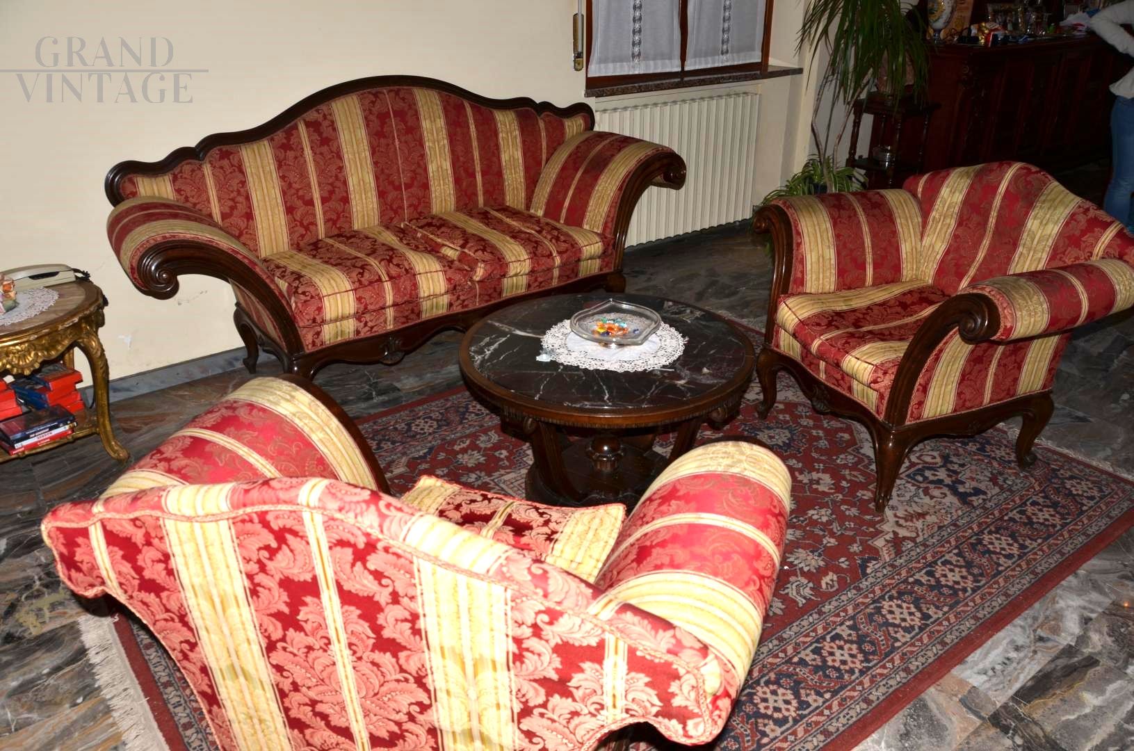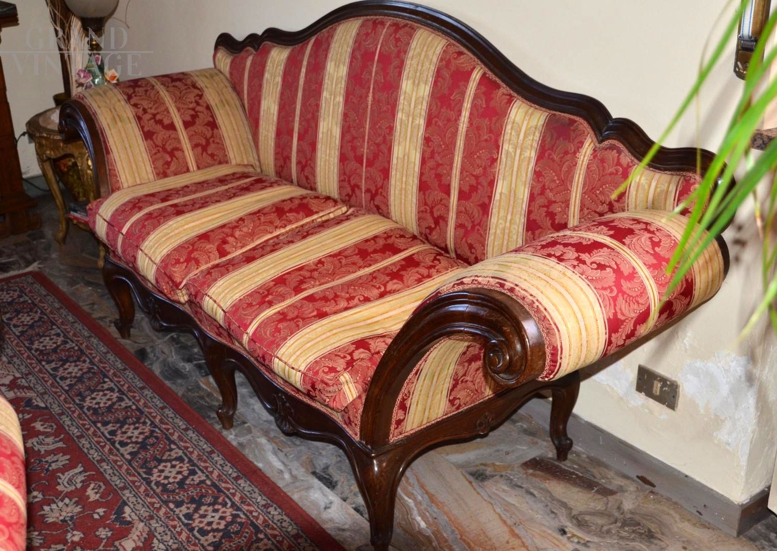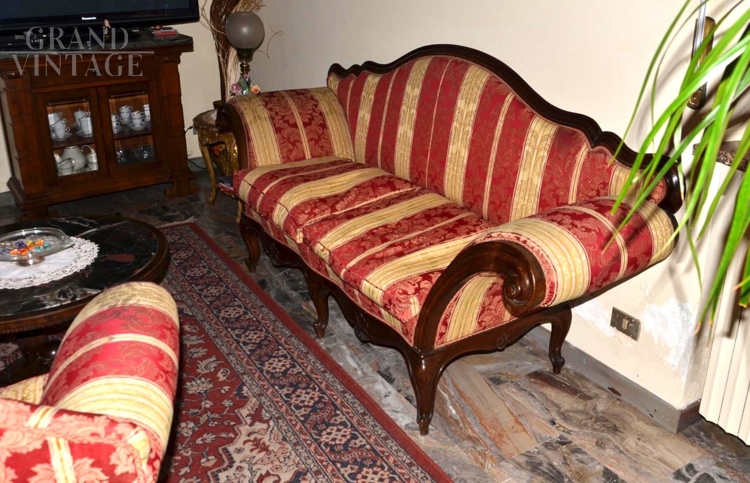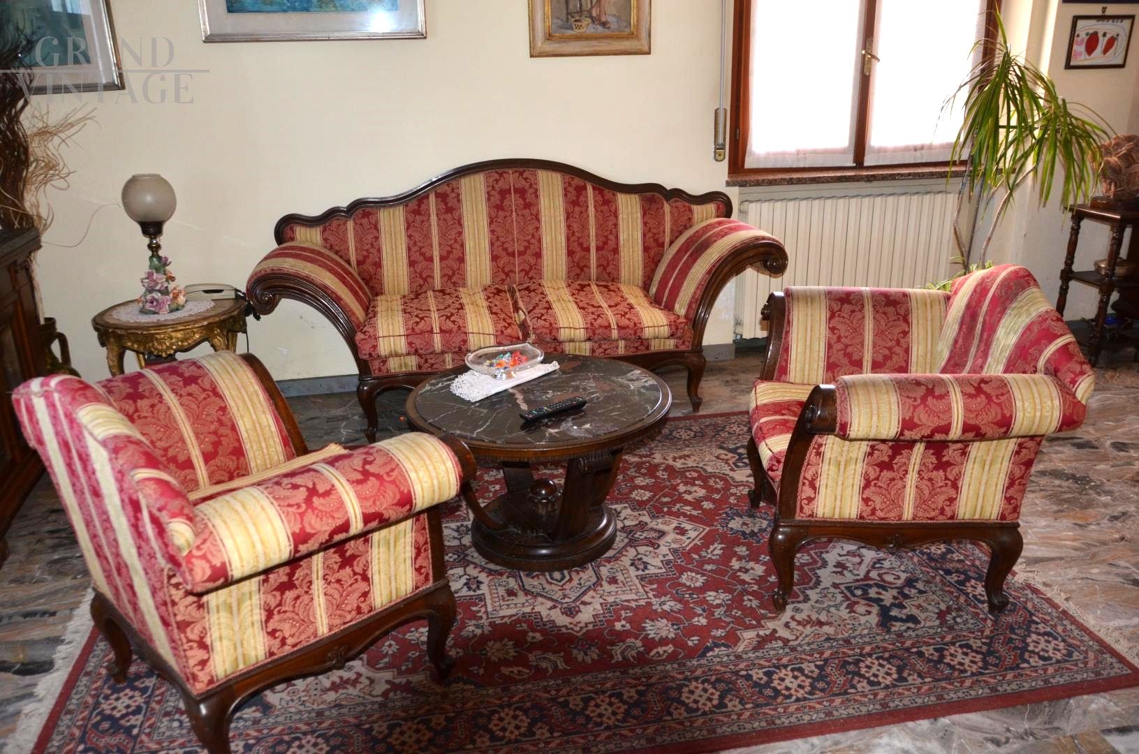 Set salotto di fine '700 composto da un divano e due poltrone, in buone condizioni, fatto restaurare quanche anno fa. Presenta solo un piccolo difetto ad un bracciolo, visibile in foto.