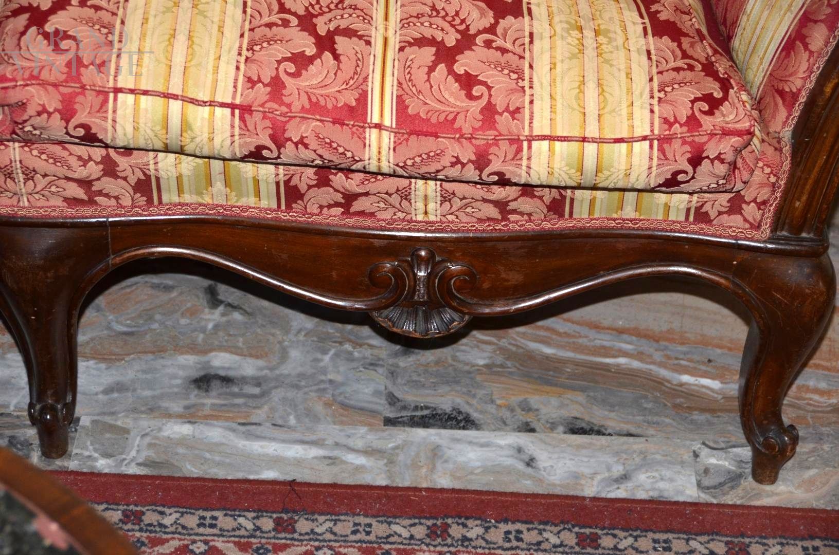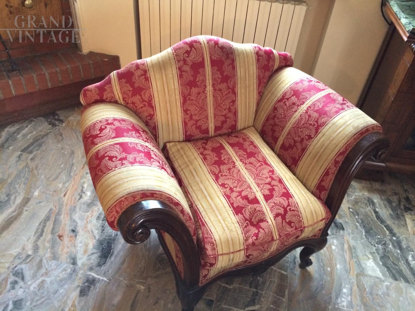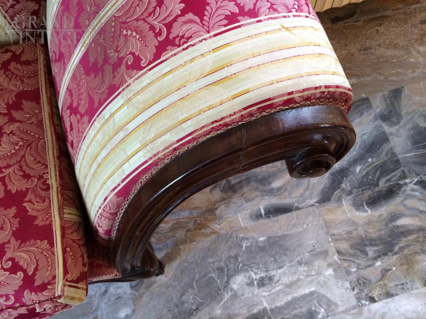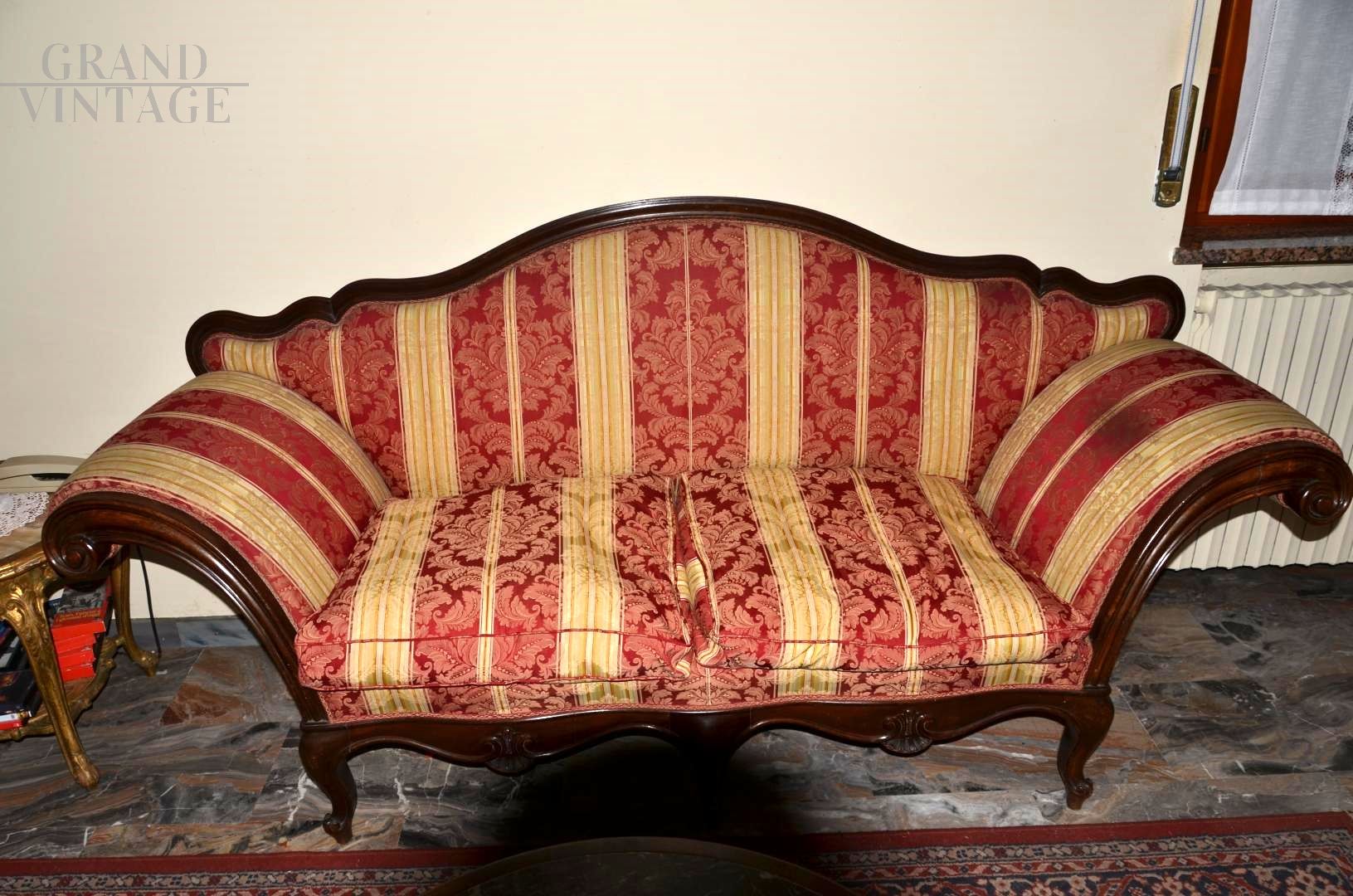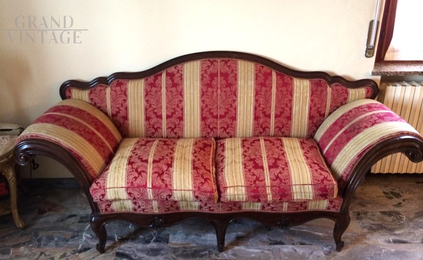 Set salotto di fine '700 composto da un divano e due poltrone, in buone condizioni, fatto restaurare quanche anno fa. Presenta solo un piccolo difetto ad un bracciolo, visibile in foto.