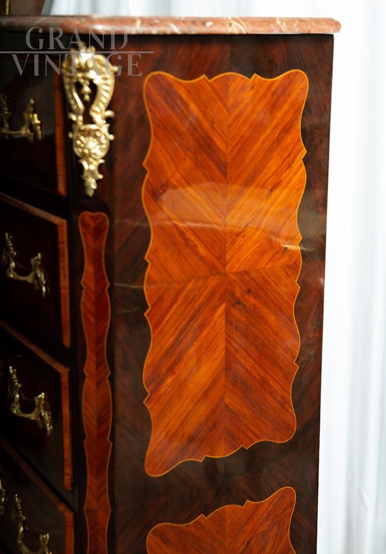 Settimino antico Napoleone III Francese in legni esotici pregiati con applicazioni in bronzo dorato finemente cesellato. Il fronte è scandito da sei cassetti adornati con belle bocchette e maniglie in bronzo dorato finemente cesellato. I due cantoni sono adornati da elementi in bronzo, mentre la base mistilinea è impreziosita da un fregio sempre dello stesso materiale e termina con due piedi a cabriolet. Sul piano poggia una lastra in marmo rosso Francia. Il settimino è stato restaurato da maestri artigiani con metodo tradizionale gommalacca e alcool fatto a mano. Provenienza: Francia XIX secolo.