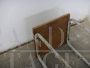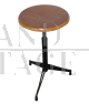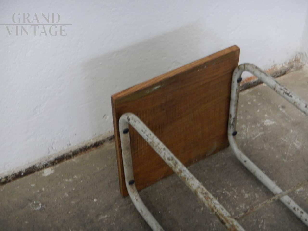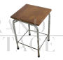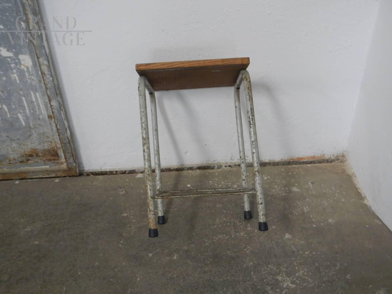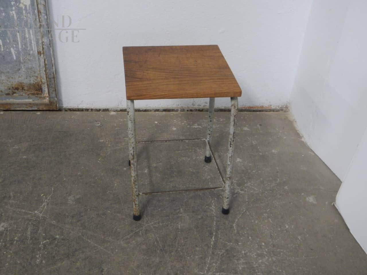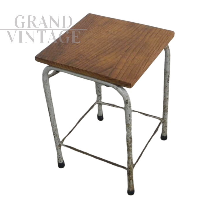 Sgabello industriale vintage in ferro laccato con seduta quadrata in legno di quercia, utile anche come piedistallo, pulito e trattato con vernice da ferro e cera da legno, conserva i naturali bei segni del tempo.