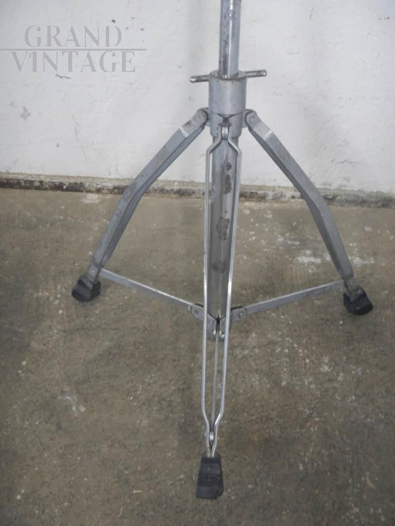 Sgabello da batteria vintage in metallo e similpelle, con struttura pieghevole. Il rivestimento in similpelle della sella è nuovo. In buone condizioni, la seduta è regolabile in altezza da cm 54 a cm 80.