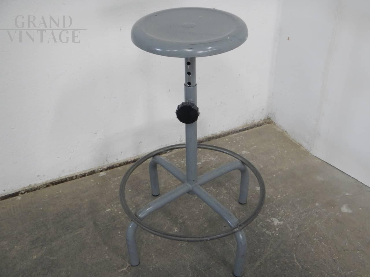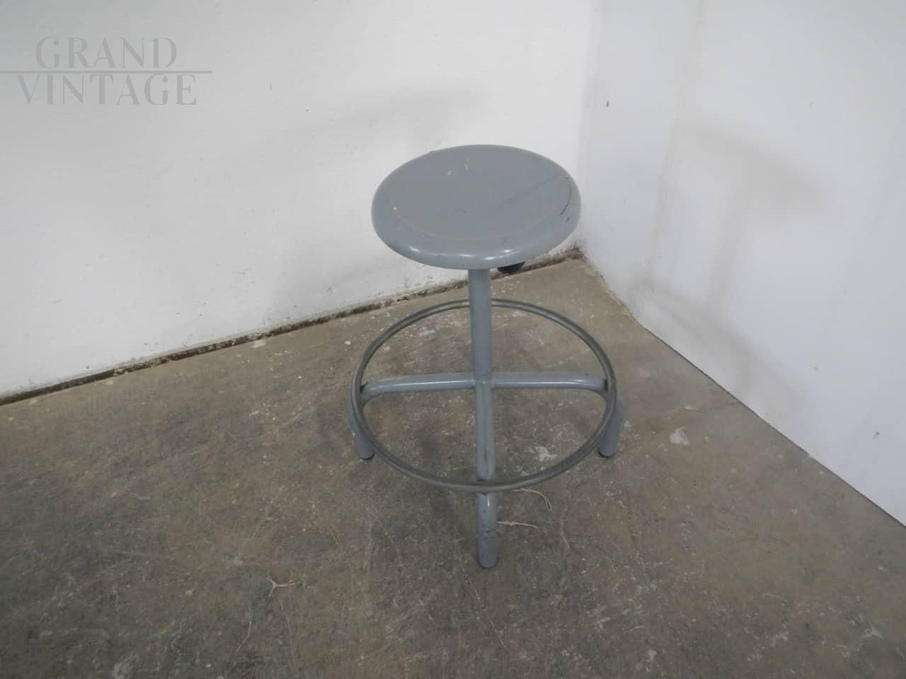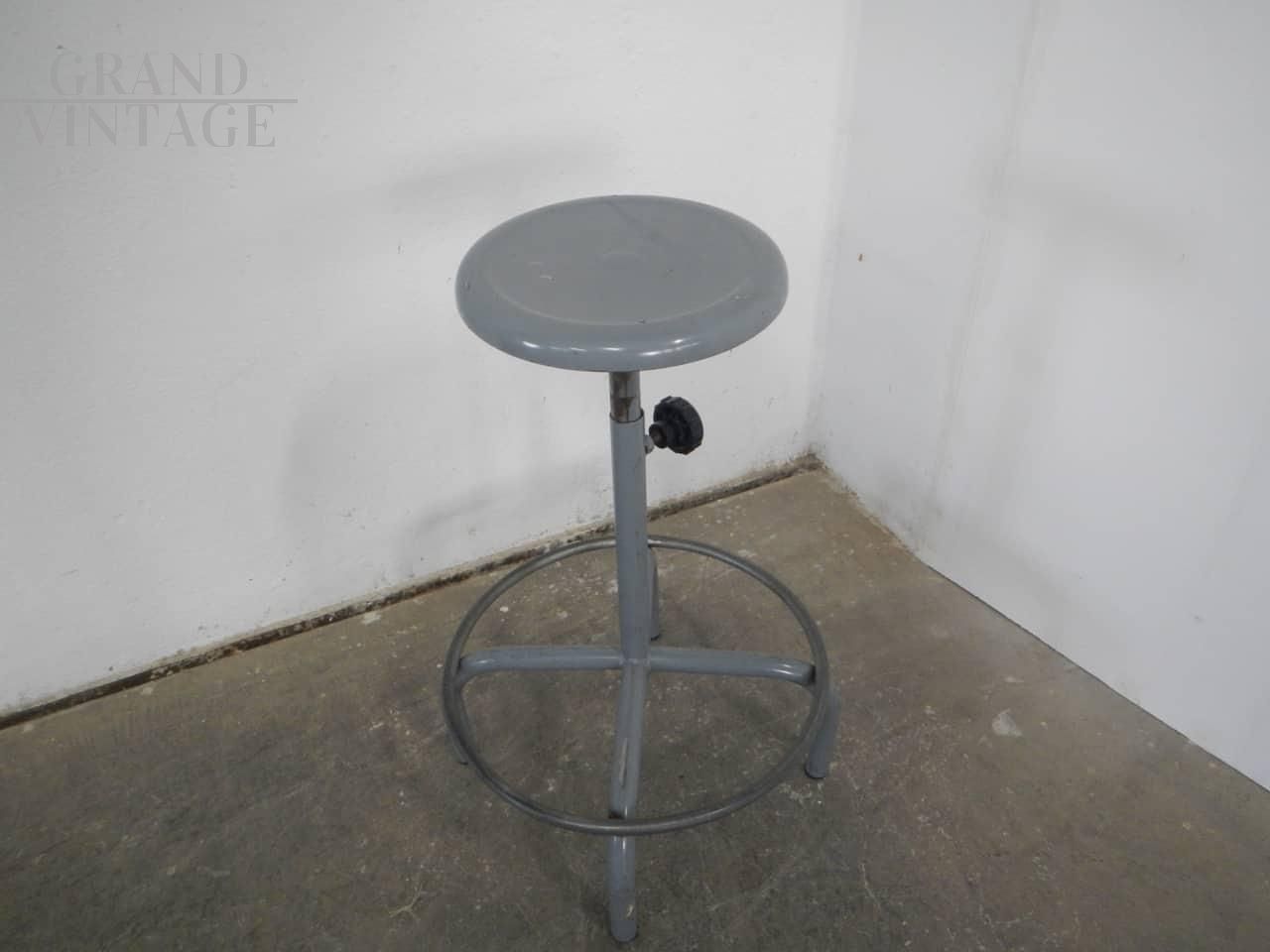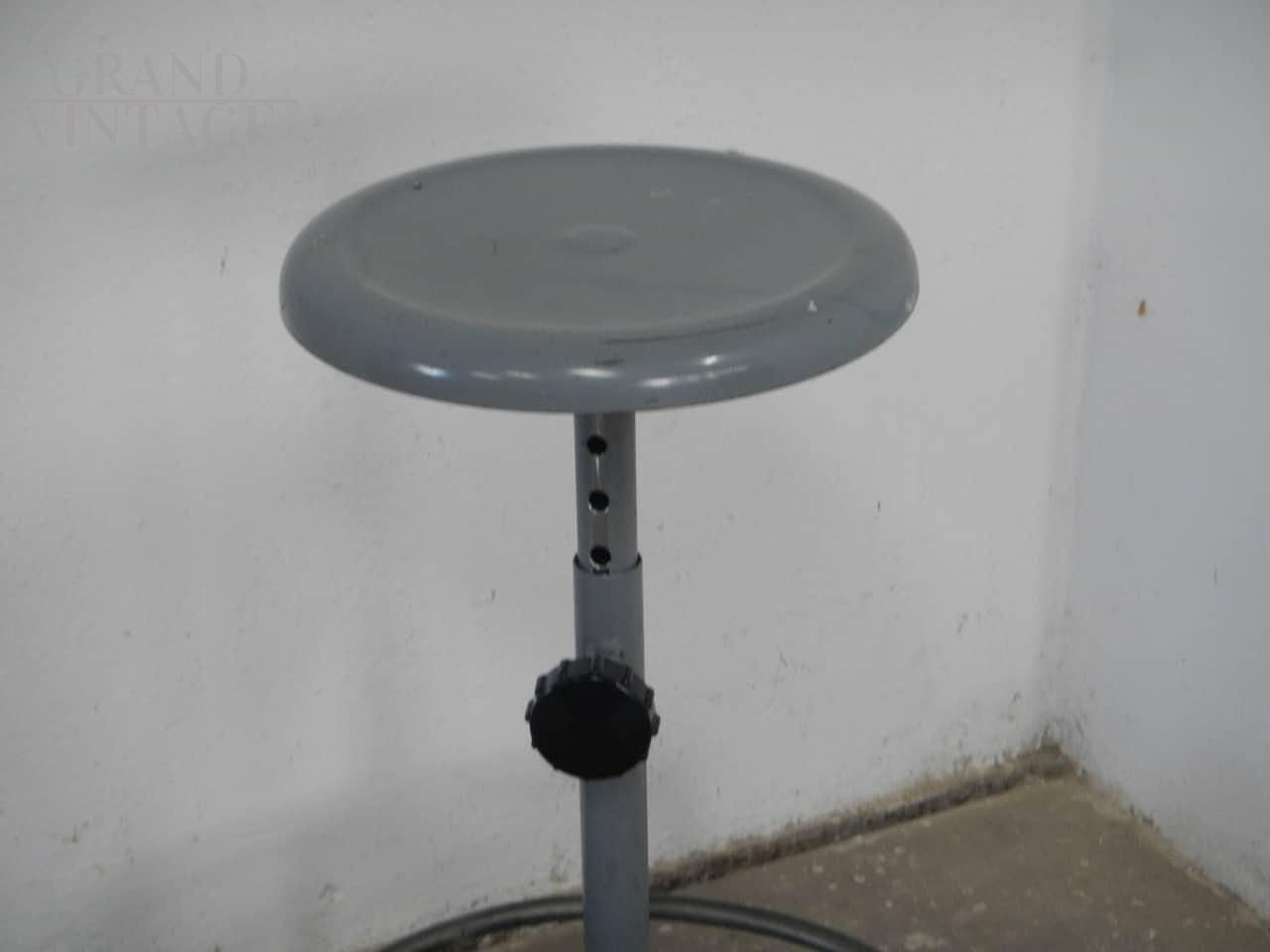 Sgabello vintage industriale regolabile in ferro grigio con 4 gambe. La seduta misura 30 cm di diametro. Regolabile manualmente da cm 77 a cm 60. In buone condizioni, la seduta presenta due fori come da foto.