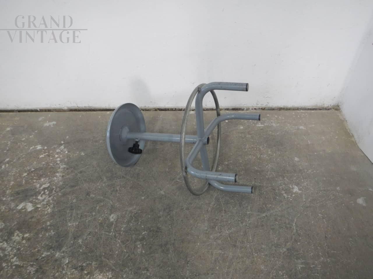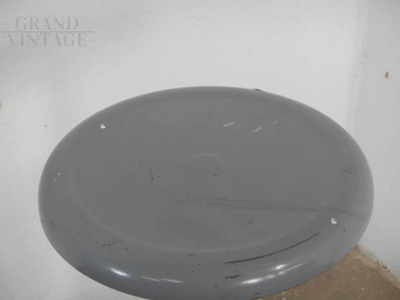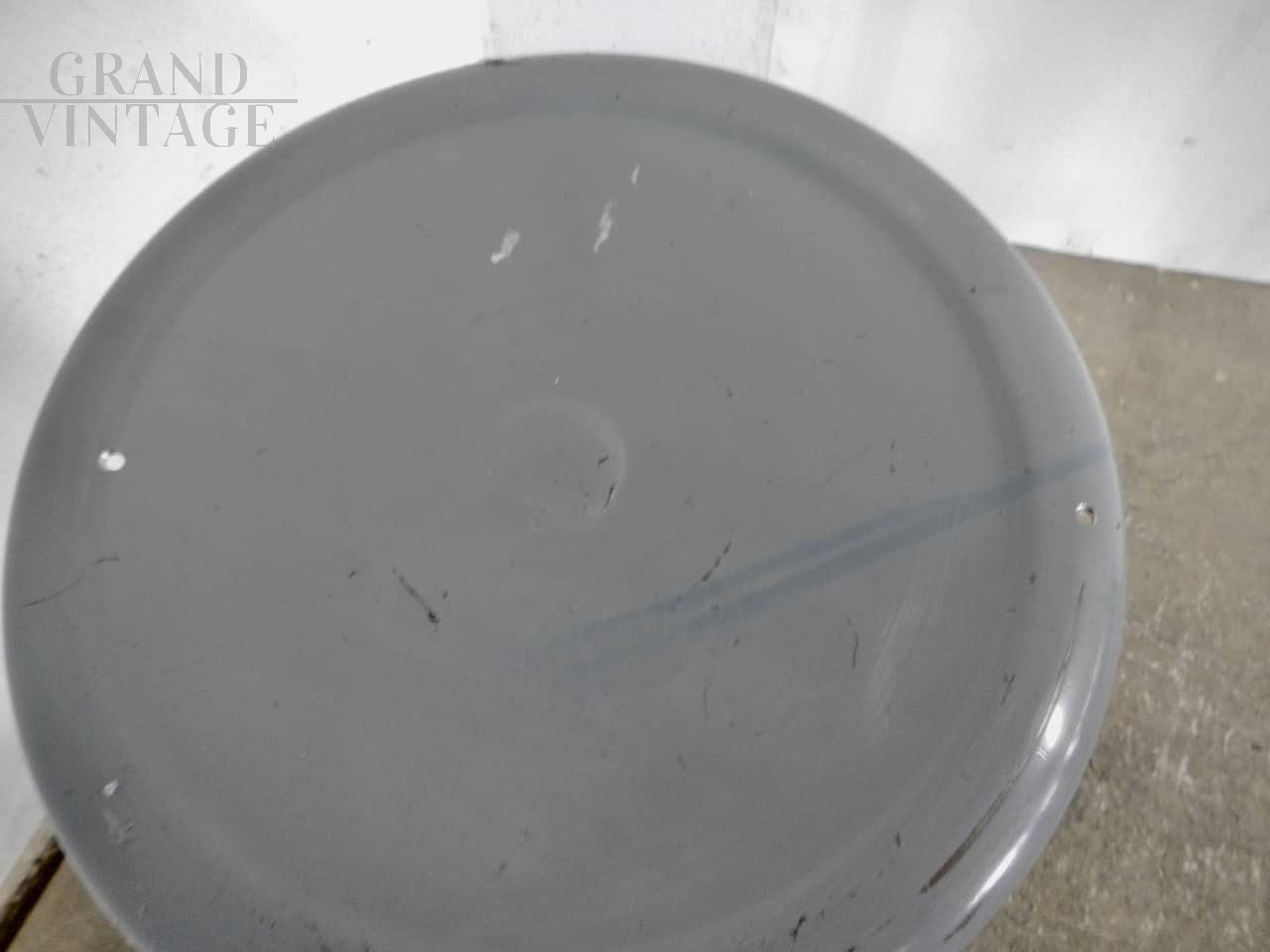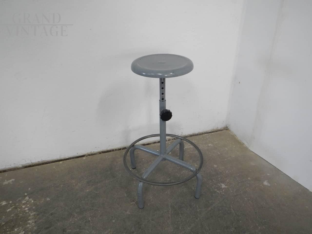 Sgabello vintage industriale regolabile in ferro grigio con 4 gambe. La seduta misura 30 cm di diametro. Regolabile manualmente da cm 77 a cm 60. In buone condizioni, la seduta presenta due fori come da foto.
